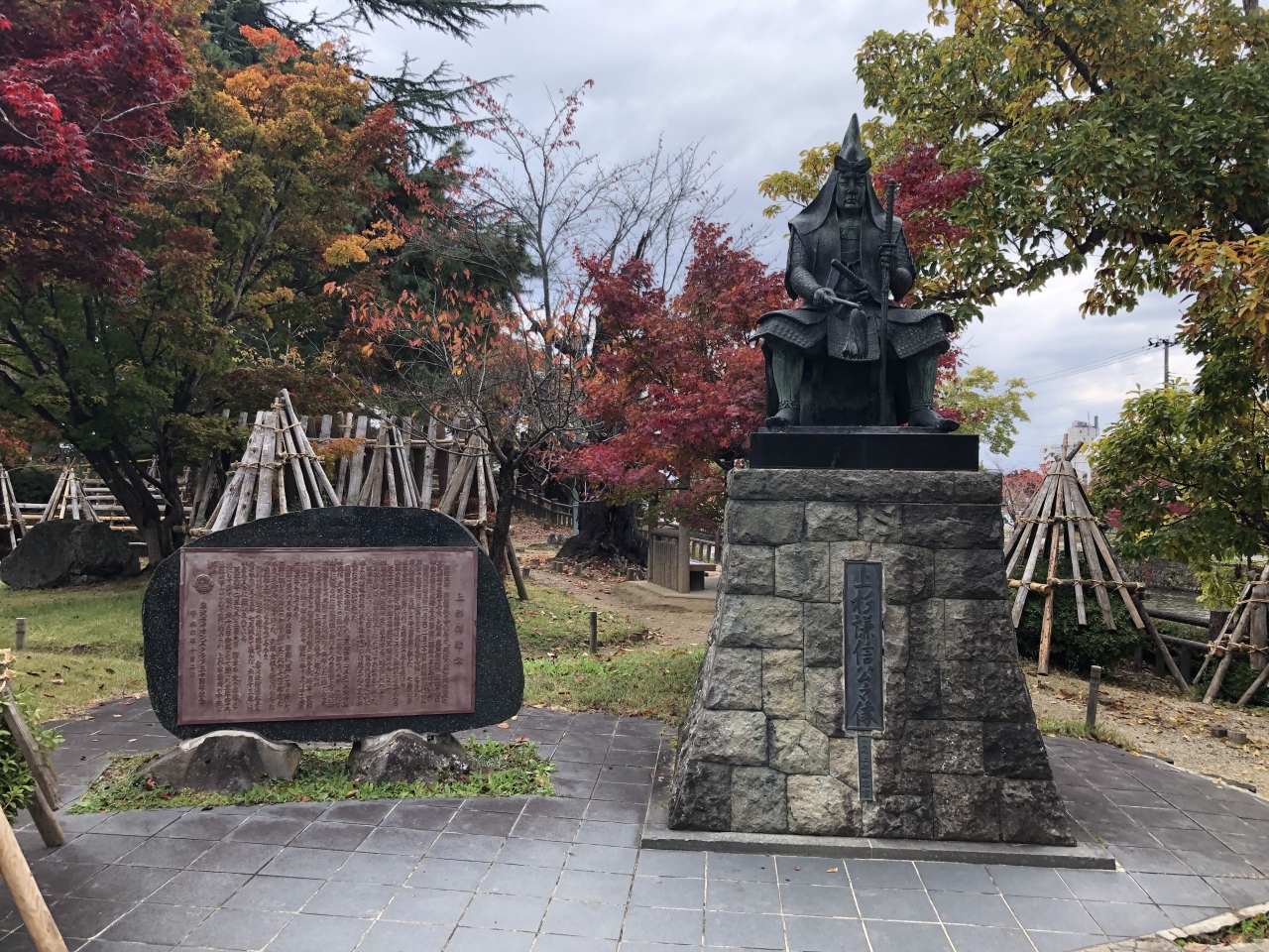 - 米沢城址(松が岬公園)にある参道に像はありますが、公園北側の無料駐車場から徒歩で5分かからない程度です。