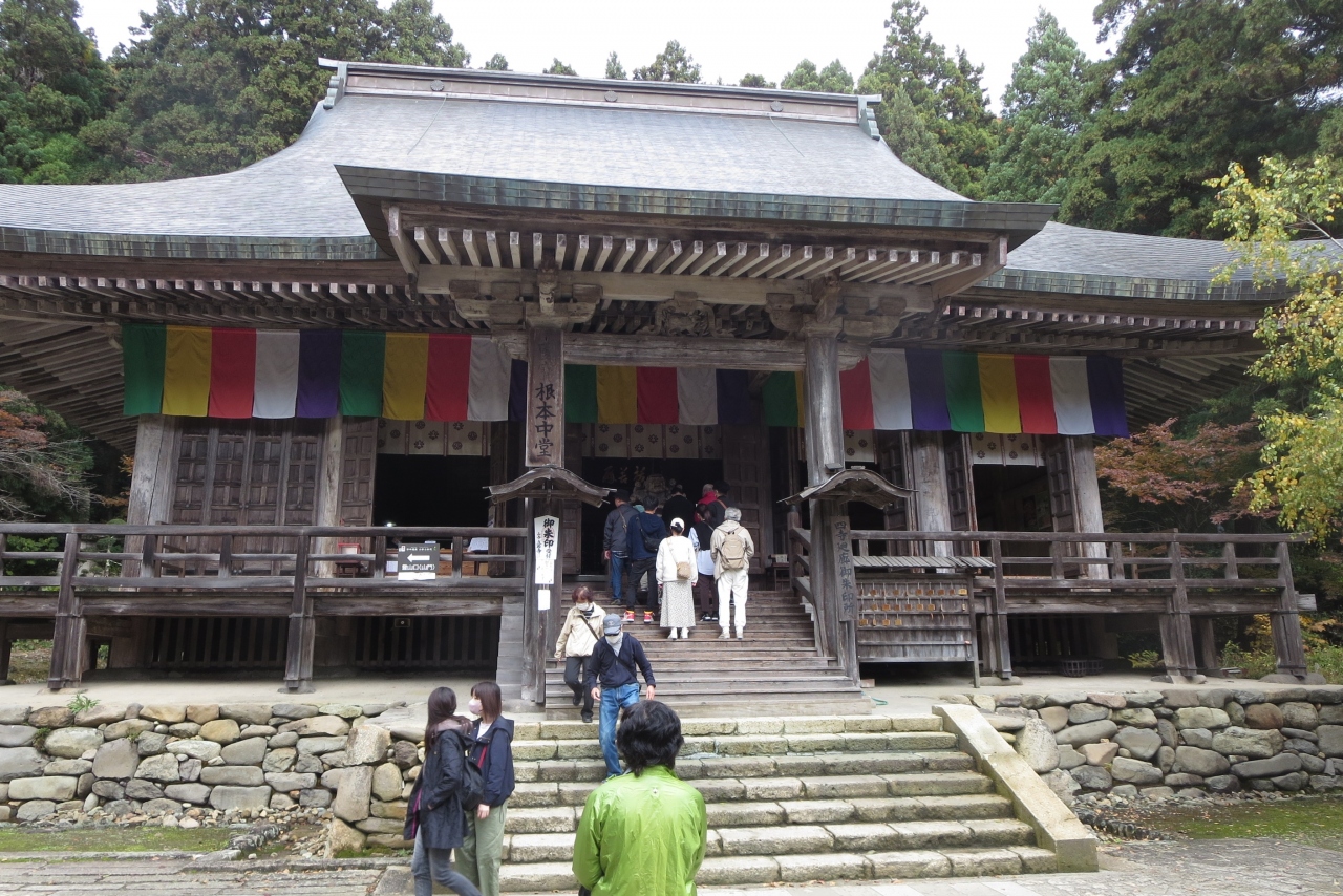 宝珠山立石寺(山寺の方が伝わるようです)は比叡山延暦寺の分院です。登山道から石段を上がったところにあります。平安時代初期に慈覚大師(円仁)が創建しました。根本中堂は本堂にあたるもので、ブナで作られた建物としては日本最古のものです。比叡山延暦寺から分火された「不滅の法灯」が千年以上灯し続けられています。根本中堂の入口にある布袋尊を撫でてからお参りするのが作法です。中堂内には薬師如来座像、伝教大師像、文殊毘沙門像などを安置されています。