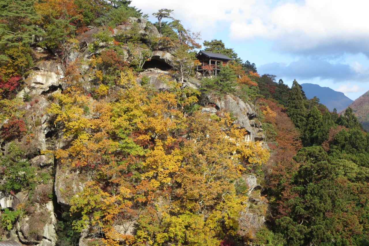 - 全山綺麗な紅葉になっていましたし、岩肌に張り付いたように見えるお堂もあり見事な景観でした。