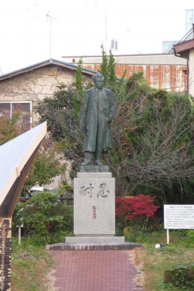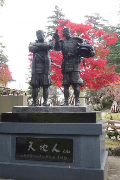 移動途中で米沢氏を通過するので、めったに行けない米沢城址を見てみよう、上杉神社の参拝をしようと思って予定にはなかったのですが立ち寄りました。肌寒い感じでしたが、紅葉も綺麗で無駄じゃなかったです。レンタカー利用でしたので、米沢城址北側の無料駐車場に車を止めさせてもらい、堀を渡って上杉神社の境内に入りました。境内には多くの像、碑がたくさんあります。「天地人像」を見つけたのでさっそく撮影しました。直江兼続の「愛」の文字を付けた兜ですぐに分かりました。上杉景勝と直江兼続が二人で寄り添った像です。10年余り前の大河ドラマは「天地人」を思い出しました。その放送を記念して建てられた像のようです。思いがけないところで見つけました。
