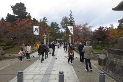 レンタカーを松が岬公園の北側にある無料駐車場に止めて堀を渡り、松が岬公園に入ります。この公園は米沢城址にあり、堀の周辺にはたくさんの桜の木があるので春に訪れると綺麗な桜が見られそうです。戦国最強と言われた上杉謙信、米沢藩の中興の祖、上杉鷹山、上杉景勝と直江兼続の「天と人」像などがあり見どころがたくさんあります。上杉謙信公にのパワーで開運招福・諸願成就のご利益がある上杉神社にまず参拝します。重要文化財がたくさんある上杉神社稽照殿もありますが、時間の関係で見られなかったのが残念でした。