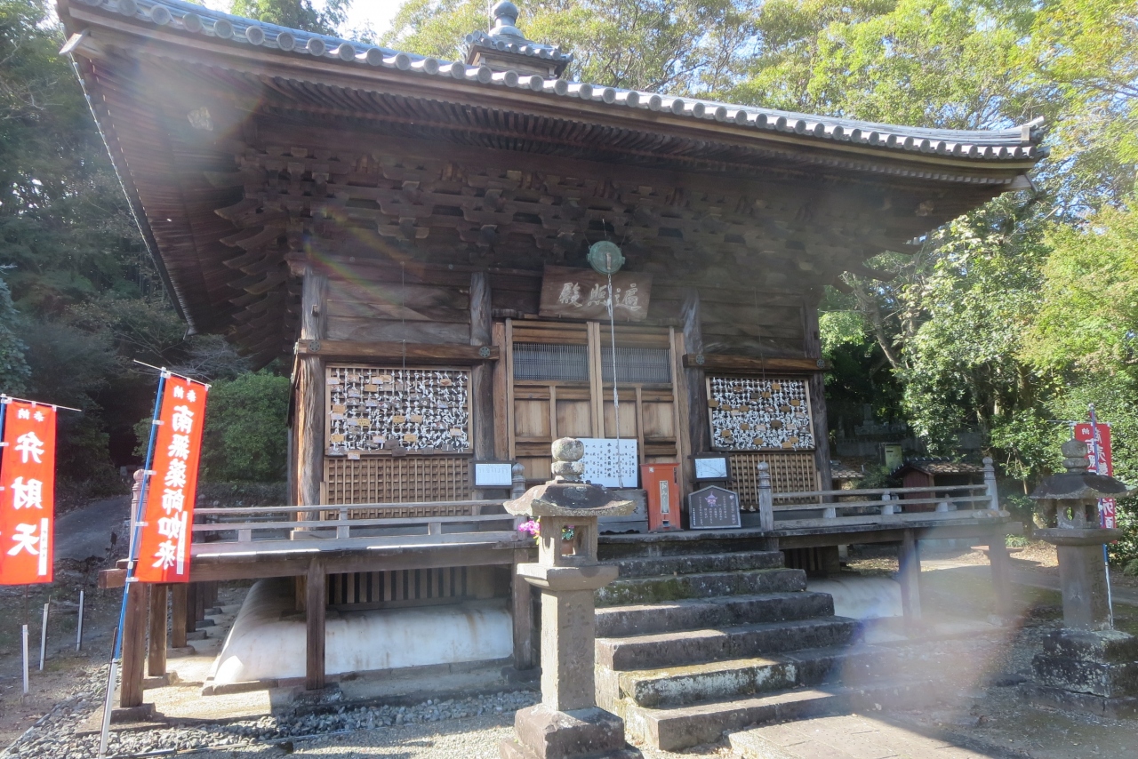 竹田市城下町交流プラザとスーパーマーケットの間にある通りからまっすぐ、十六羅漢のある長い階段をを登り詰めると願成院本堂(愛染堂)があります。江戸時代初期、寛永年間に藩主中川久盛が建立したお堂で、縁結びのスポットでもあります。竹田市内で最も古い木造建築物です。宝形造りの建物で瓦葺きの立派な建物です。年に2回、春と秋に御開帳があり、内部を拝観できるそうですが、今回は内部が見られませんでした。内部には天女などの壁画が描かれているそうです。