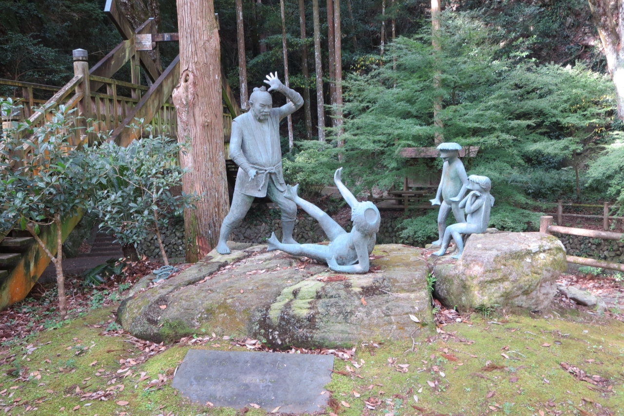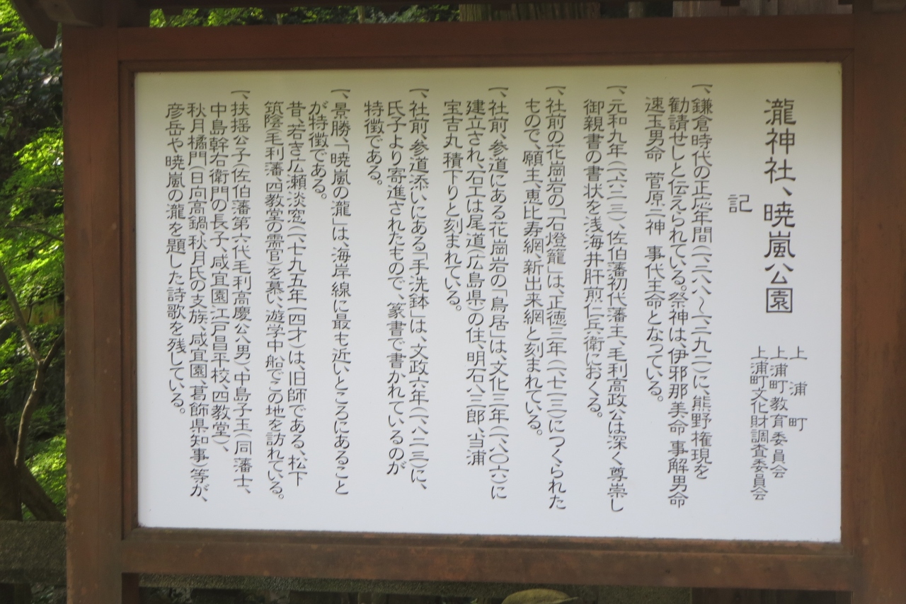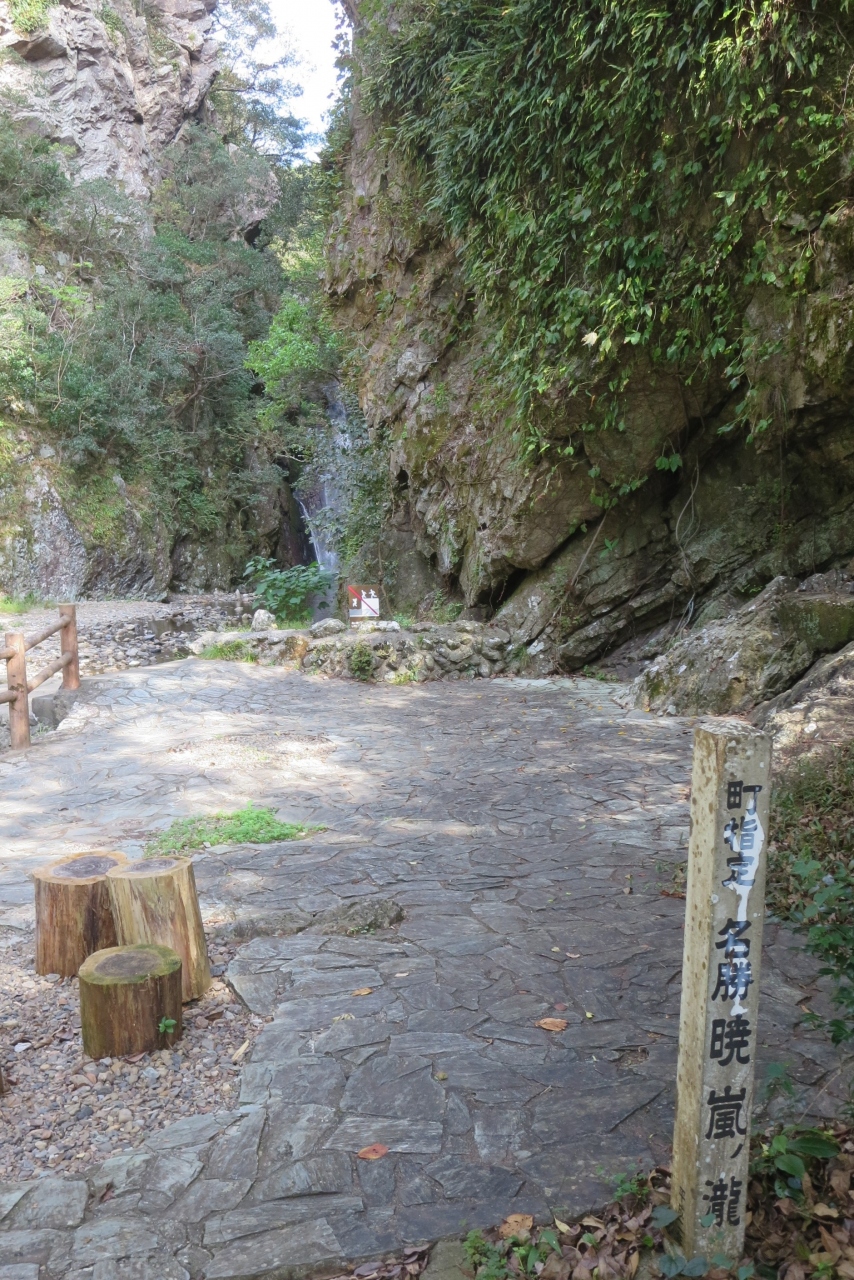 JR日豊本線の浅海井駅から500mほど行くとある暁嵐公園です。大分百景の一つに数えられる「暁嵐の滝」、本殿の裏が絶壁になっている「瀧三柱神社」があるります。この神社は700年の歴史があり藩るそうです。滝の下流はよく整備されていて、水遊びができそうなところです。また瀧三柱神社前は日本庭園のようになっています。また公園の中心になる石庭は、京都龍安寺をイメージして作られたものだそうです。