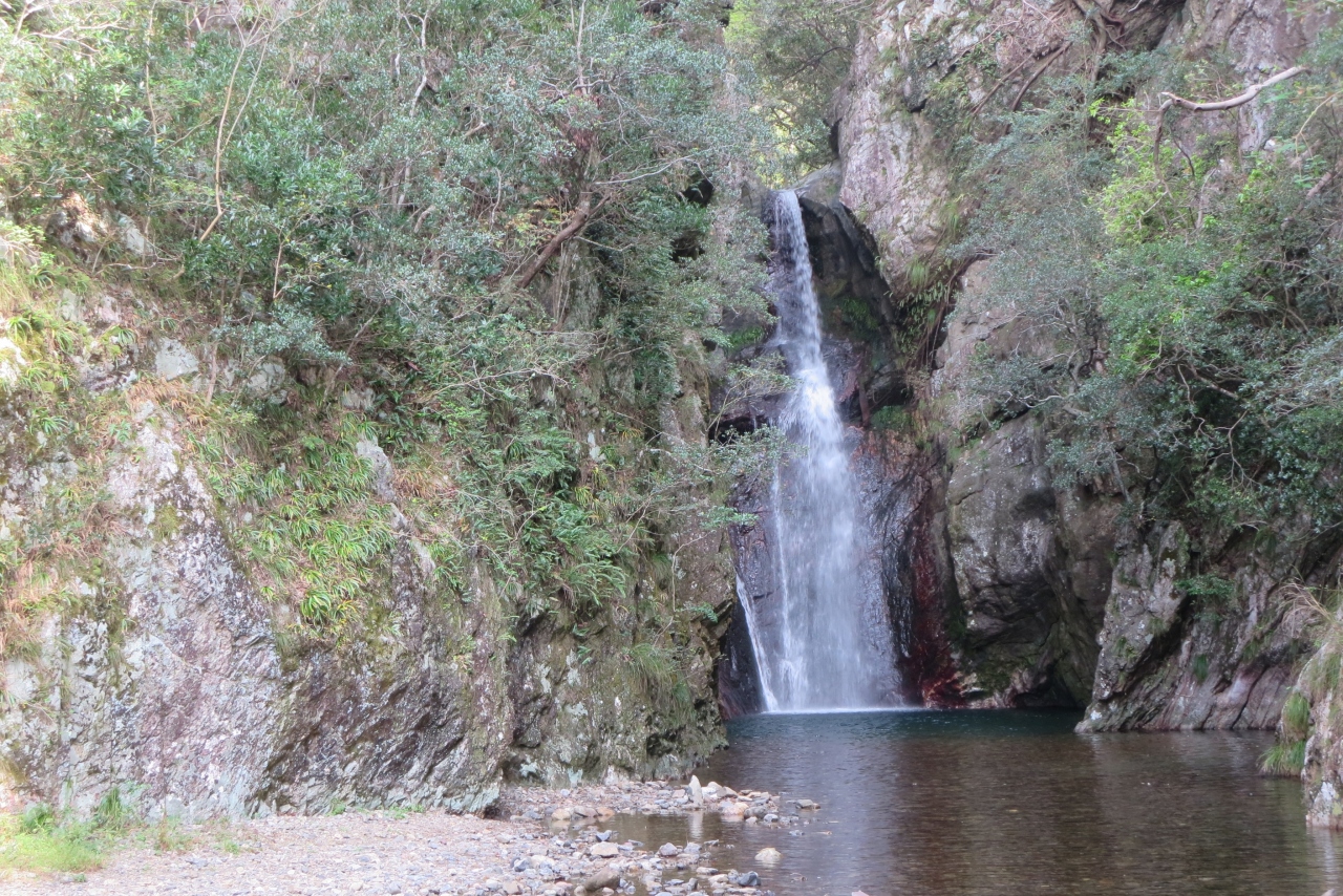 JR日豊本線の浅海井駅近くで、国道217号線からから踏切を渡り線路沿いに戻るような道を500mほど行くとある滝です。海岸線から近い滝は珍しいのじゃないでしょうか。一帯は暁嵐公園になっていて、水遊びもできるようなところです。滝は両側から岩壁が迫り、その間から流れ落ちています。高さ14mあるそうで、大分百景にも数えられているそうです。