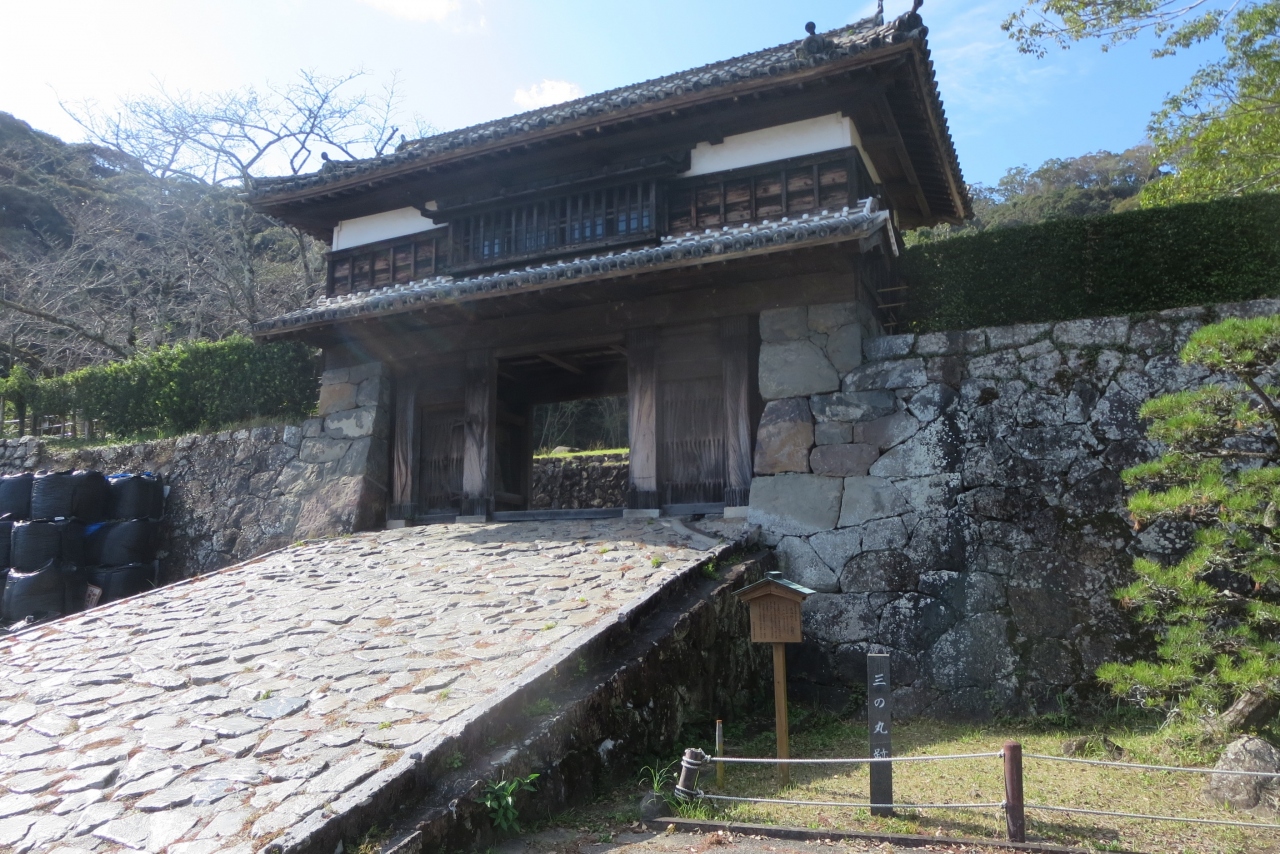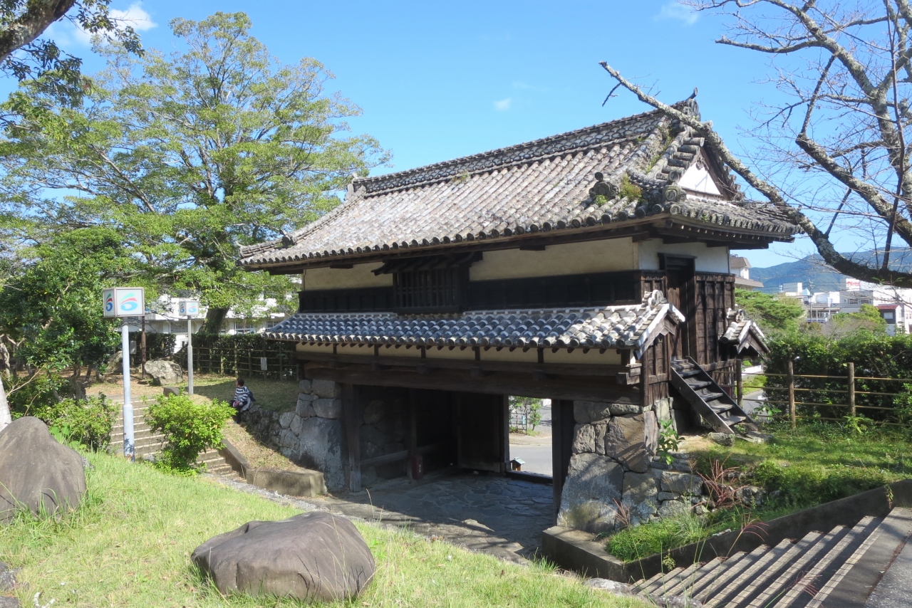 JR佐伯駅前から国道217号線を南西方向に2㎞ほど行くと右手に入ったところにあります。城山(標高144m)に江戸時代の初期、慶長年間に佐伯城が築かれます。山頂にあった本丸には石垣のみが残っています。南側には城より少し遅れて造られた佐伯城三の丸櫓門が残されています。別名「黒門」と呼ばれています。山頂の本丸からこの櫓門に藩の機能が移され、それ以後は藩の中核になりました。入母屋造りで瓦葺の櫓門は、再建や修理をされて現在に至っています。