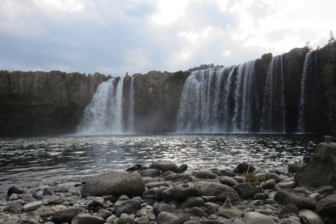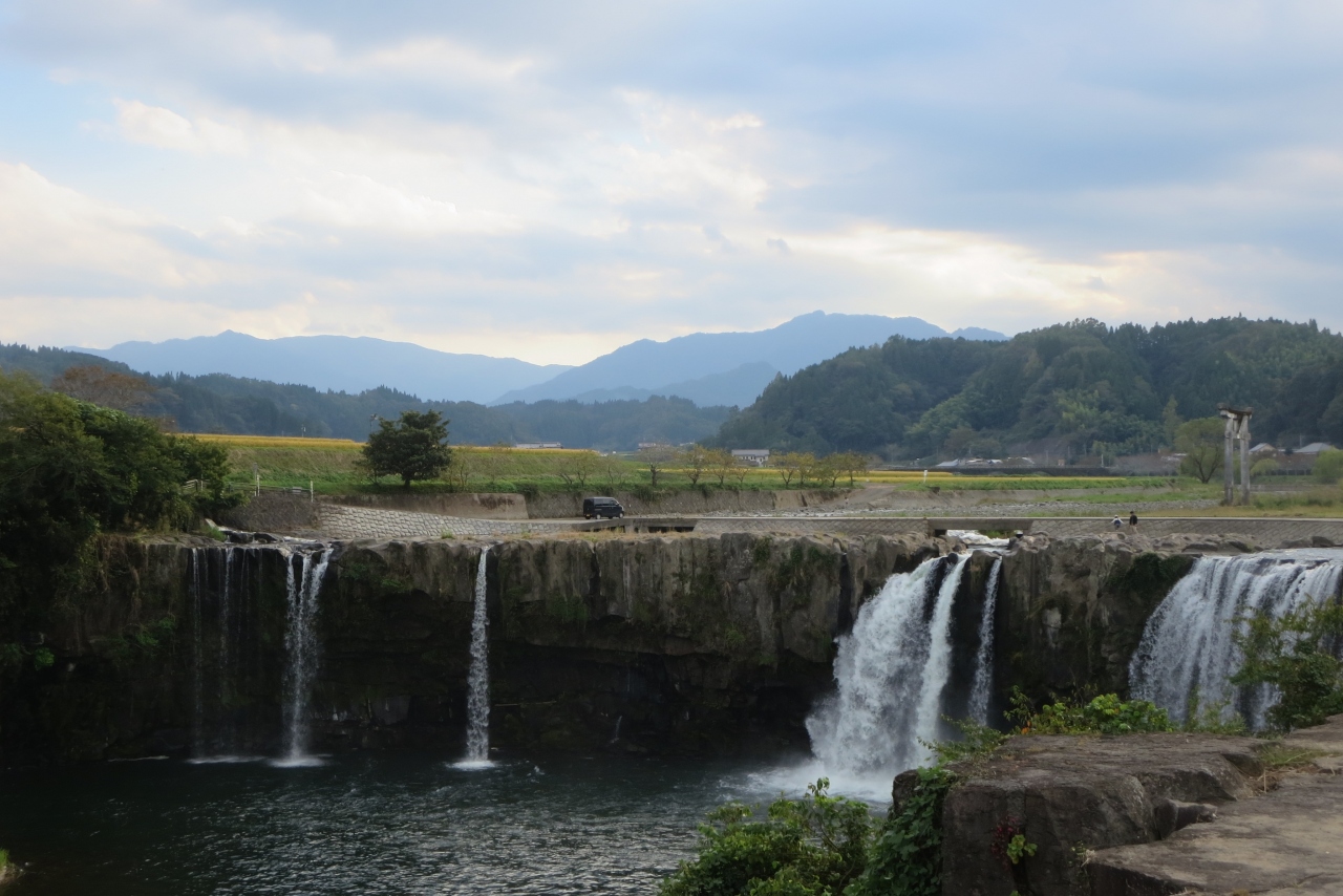 日本の滝100選、大分県百景にあげられる名瀑です。豊後大野市緒方町の一面田園風景が広がる平野のど真ん中に、場違いな感じでこの滝があります。滝の形状は、ナイアガラ滝に似ているので東洋のナイアガラと言われています。滝は幅120m、落差20mあります。この滝は阿蘇山の大噴火で発生した火砕流が何十メートルも堆積し冷えて固まる時、柱状節理ができました。そこに川の水が流れ込んでこの滝が作られたそうです。滝の正面(下流側)には滝見橋という吊橋があり、上流には沈下橋があります。これらの橋を使うと滝の周りを一周できる遊歩道があります。
