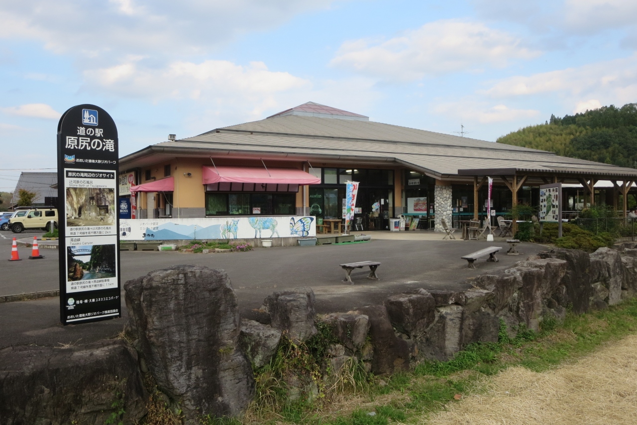 豊後大野市の緒方駅から3㎞ほど西の方に走ったところに「東洋のナイアガラ」と言われる原尻の滝があります。その滝を見物に訪れる観光客のための施設です。道の駅原尻の滝には広い駐車場、物産館、レストランなどがあります。滝見物の後にトイレ休憩を兼ねて物産館に立ち寄りました。販売しているものは大分県内の道の駅とあまり変わりはないようです。大分特産のカボスを使ったお菓子、地元産の米、お酒などたくさん並んでいました。