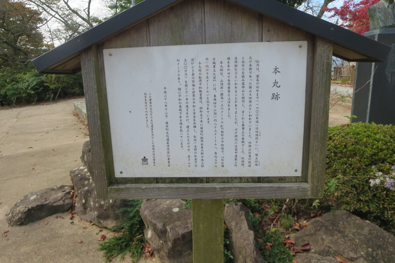 仙台から宿泊地である福島県二本松市まで国土号線を南下。このままではホテルのチェックイン可能な時間のかなり前に到着すると思って、どこか立ち寄るところはないかなと地図を探していたらこの公園が見つかりました。国道4号線をからそれて国道349号線に入り船岡城址公園のそばまでは道が分かりやすかったのですが、どこから公園に入るのかカーナビにも表示されませんでした。地元の方に公園入口がどこか訪ねてやっと駐車場に到着しました。城址公園らし有名な樅木の巨木もあります。駐車場横には観光物産交流館があります。