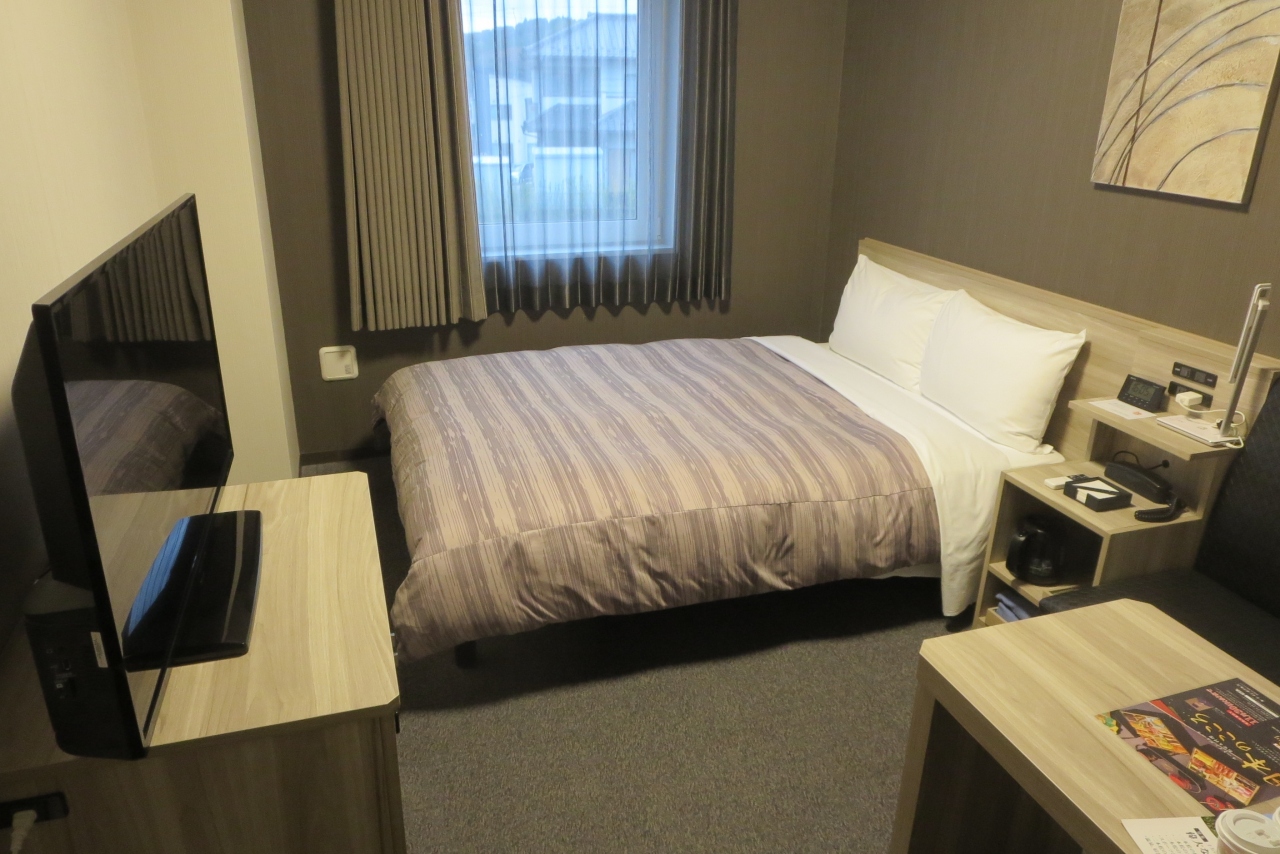 国道4号線のインターで降りるまではよかったのですが、目の前に見えるホテルに行くのに手間取りました。インターは高速道路のような立体交差ですので分かりにくかったです。駐車場も広く停めやすいです。部屋は国道に面していましたが、騒音に悩まされることなく熟睡できました。部屋は清掃が非常によく清潔感があります。広めのベッドにちょっと窮屈なソファー付きです。浴室・洗面・トイレはユニットタイプですが、それほど窮屈な感じはありません。唯一困ったのは夕食です。外に出ようと思ってもほとんど飲食店がないし、車で出かけるのも億劫なのでホテル内のレストランで食事をしました。