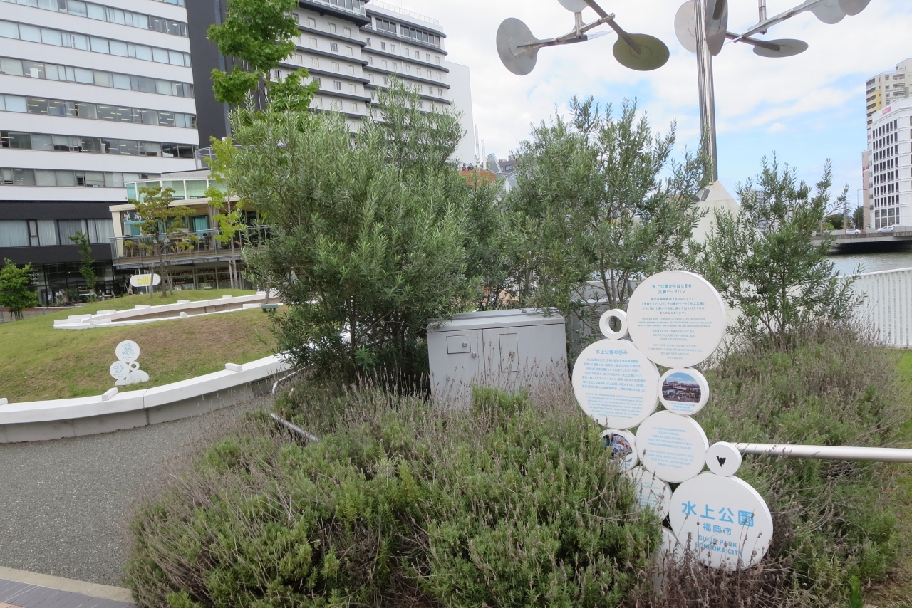福岡市の西中洲に昭和天皇の御成婚記念として整備された公園でした。福岡市の中心部にあったのですが、利用されることが少なく半ば忘れられた存在でした。那珂川の水辺空間を活用するために2016年にリニューアルされました。公園内には「シップス・ガーデン」という名の船をモチーフにしたレストランが福岡市中心部の再開発プロジェクト「天神ビッグバン」の先駆けとしてできました。海からの心地よい風が吹く場所ですので気温が高くても過ごしやすく、休憩スペースや勾玉を模ったベンチなどが設けられています。