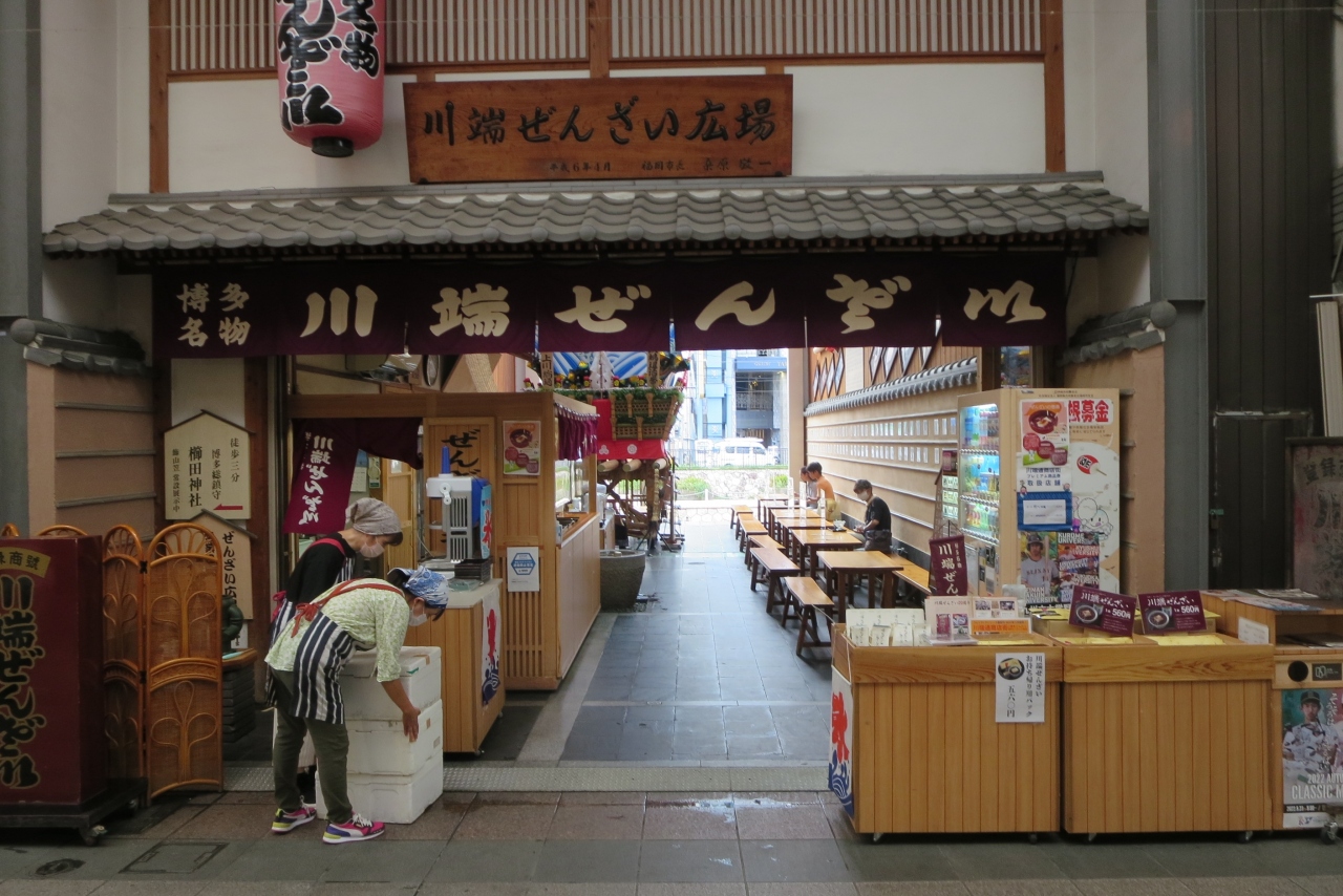 場所は明治通りから川端商店街に入り徒歩で数分のところにあります。元になったお店は昭和60年に店じまいされましたが、それまでは「日本一の甘いぜんざい」を提供していたそうです。その店を懐かしみ地元の方々が開店したお店が「川端ぜんざい広場」です。店内に入ると注文するカウンターのような場所と、ぜんざいをいただく席があります。また博多らしく山笠が飾ってあります。店頭ではお持ち帰り用のぜんざいの販売もしています。メニューは店内でいただくぜんざいとと持ち帰り用のぜんざい、氷ぜんざいです。暑い日ですので水分補給も兼ねて氷ぜんざいをいただきました。餡はかなり甘く、聞いていた川端ぜんざいの甘さを再現しているようです。歩き疲れた身には疲労回復になりました。