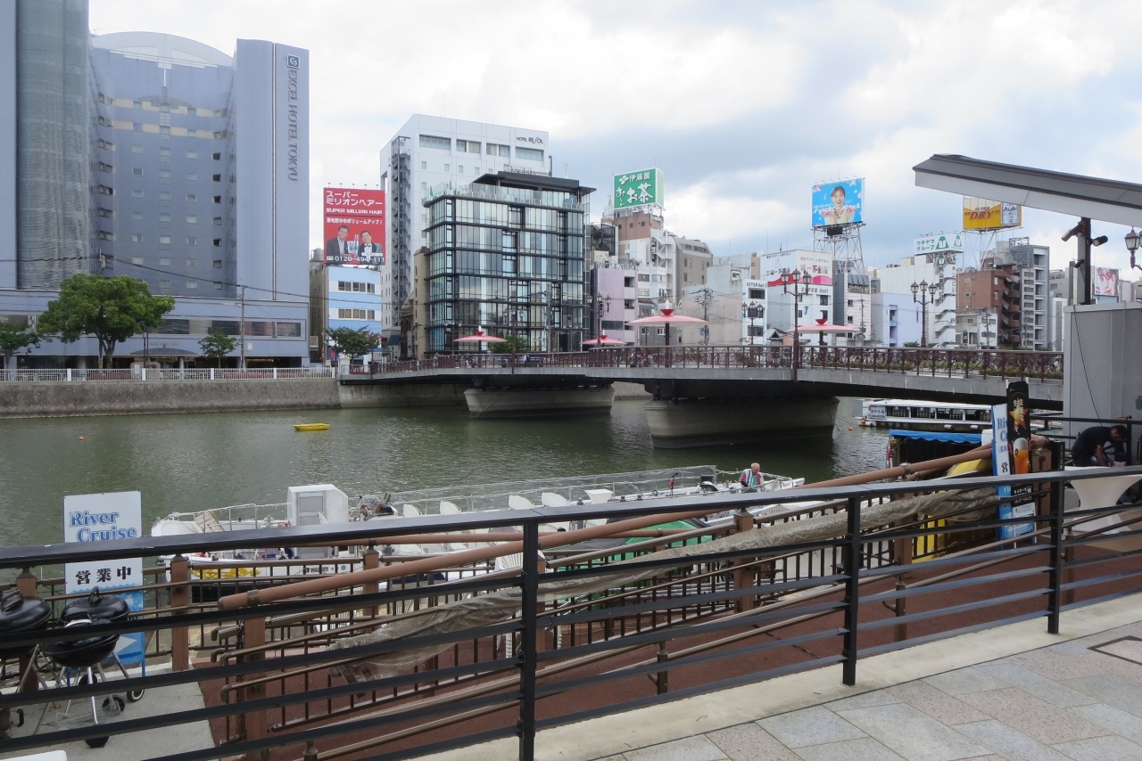 福博であい橋は明治通りの西大橋から那珂見て那珂川の一つ上流ある橋です。那珂川を挟んで東側の商人の町「博多」と西側の武士の町「福岡」に分かれていた二つの町が出会うので、この橋の名前になったそうです。橋の長さ78.2mあり、橋は丸く膨らんだようになっている場所が2か所あり、そこにはベンチが置かれています。橋を渡る以外の機能を持たせています。ゆっくり那珂川の風景を眺めて休憩するのもよいと思います。楽しむことができます。夕方になるとパフォーマーがやって来て、楽器演奏や大道芸のようなものを見せる人も現れます。この橋の西側には水上バスの乗り場があります。