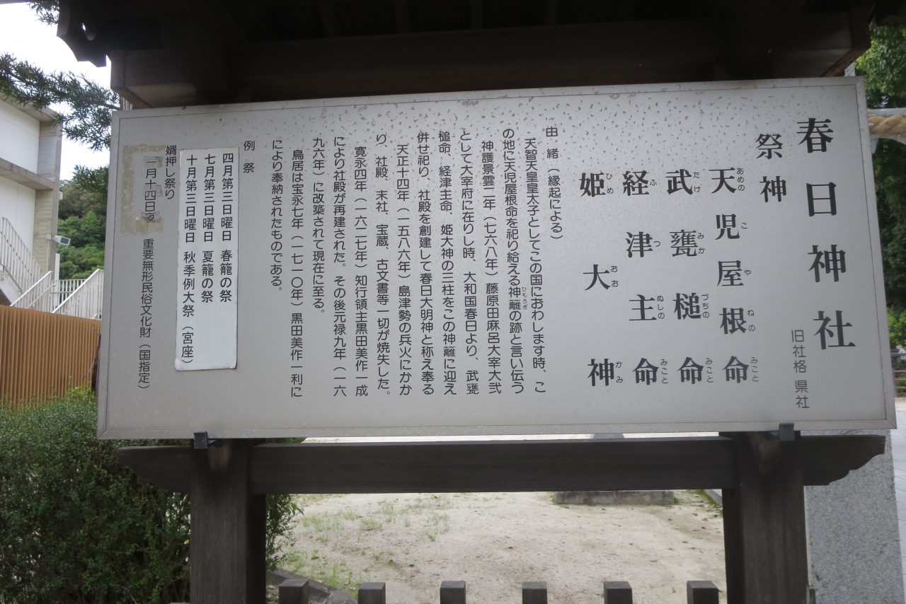 起源は藤原田麻呂が大宰大弐として大宰府にいた768年にさかのぼるそうです。1586年に島津勢の兵火に焼かれ、社殿、末社、宝蔵、古文書などの全てが焼失しました。黒田長政の家老黒田一成の手により再建され、その後の改築などを経て現在の姿になっているそうです。有名なのは「春日の婿押し」と言われる行事で、毎年1月14日の夜に前年に結婚した氏子の新郎新婦を披露する行事があります。