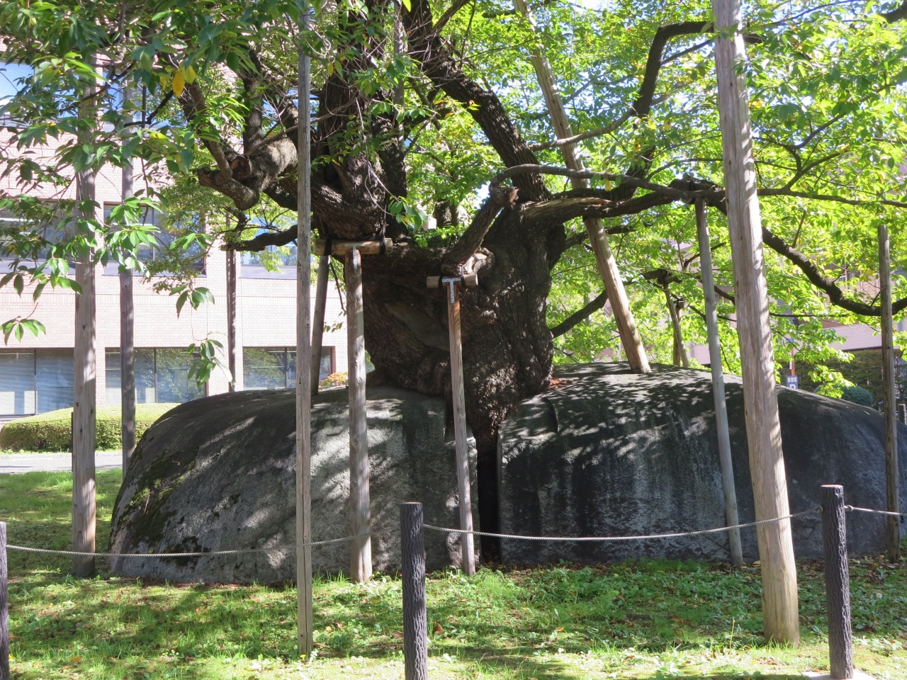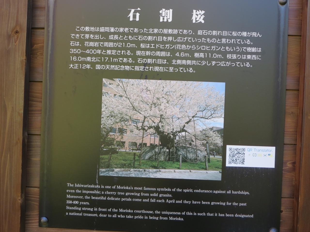 JR盛岡駅から歩いて20分ほどの距離にある盛岡地方裁判所の構内にあります。構内に入ると目の前にあります。巨大な花崗岩の割れ目にしっかりと根を張っている立派な桜があります。樹齢360年を越えるそうですが、花崗岩の割れ目に根を張る桜には、その生命力を感じざるを得ません。4月の中から下旬には桜は開花するそうですが、訪れた時期はちょっと早すぎました。もとは盛岡藩家老の屋敷内の庭にあった岩が落雷で割れ目ができ桜の種が入り込み成長したものだとそうです。