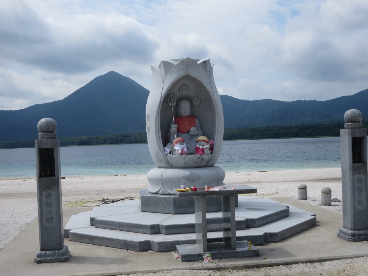 慈覚大師円仁によって千年余り前に開かれた霊山です。50年前、早朝に訪れた恐山は薄気味悪さを感じる霊場でした。その後ずいぶん整備されたようで、霊場感は薄らいでいます。当時の面影は硫黄臭の漂う木造の浴場だけのようです。恐山らしい硫黄臭と荒涼とした風景に出迎えられて、一気に50年前に訪れた青春時代を思い出しました。恐山の入口にある赤い太鼓橋は地獄の針の山に見えて悪人は渡れない(老朽化しているので渡ったら危険だそうですが)そうです。宇曽利湖の極楽浜は非常にきれいですが、恐山にいるという意識のせいか不気味な感じがします。またお土産屋さんや食堂などもできていて、ずいぶん変わったものだと思いました。