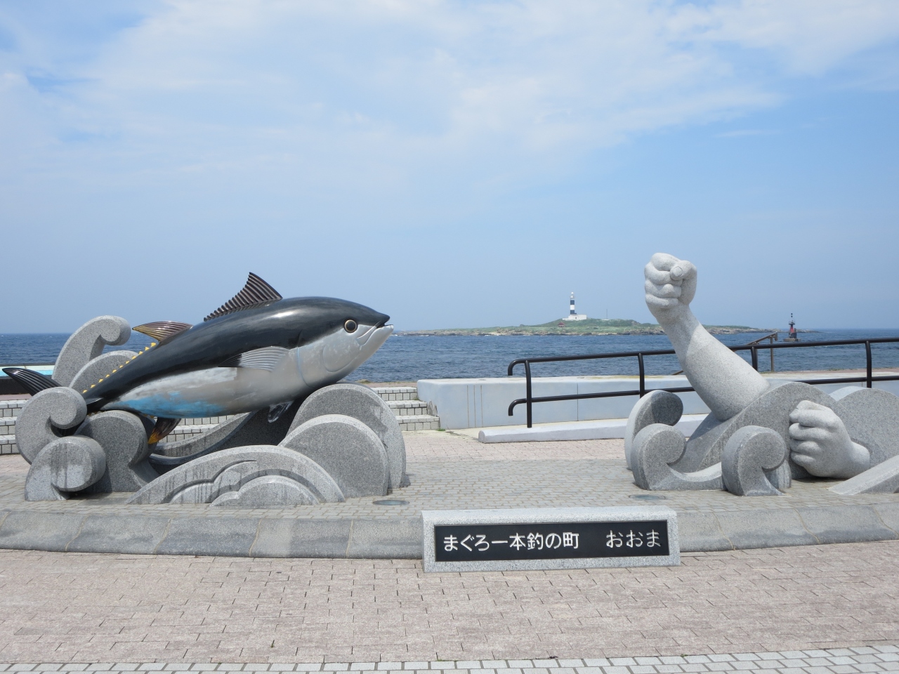 ついに来ました本州最北の地。思えば沖縄の辺戸岬、北海道宗谷岬、能登半島禄剛崎など最北端コレクションに一つ増えました。大間のマグロで有名な大間崎です。沖合にある弁天島には白と黒に塗分けられた大間崎灯台があり、その向こうには北海道の渡島半島が見えます。やはり大間の代名詞はマグロです。マグロの一本釣りをモチーフにした大きなマグロと漁師さんの力強さを感じる腕(握りこぶし)のモニュメントは見逃せないスポットです。近くにはマグロがいただけるお店や土産物店がありました。