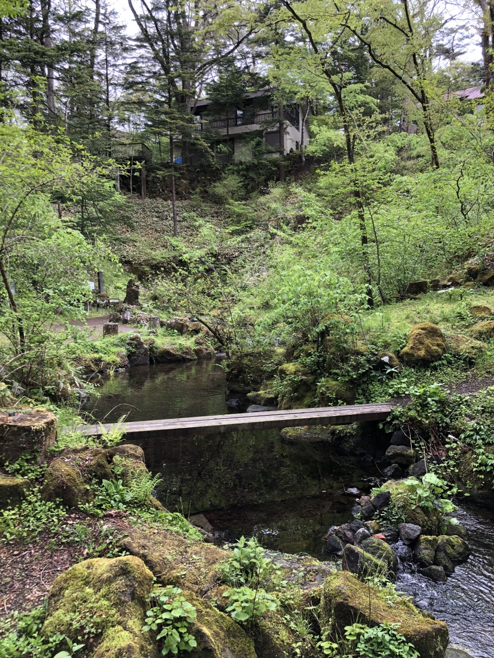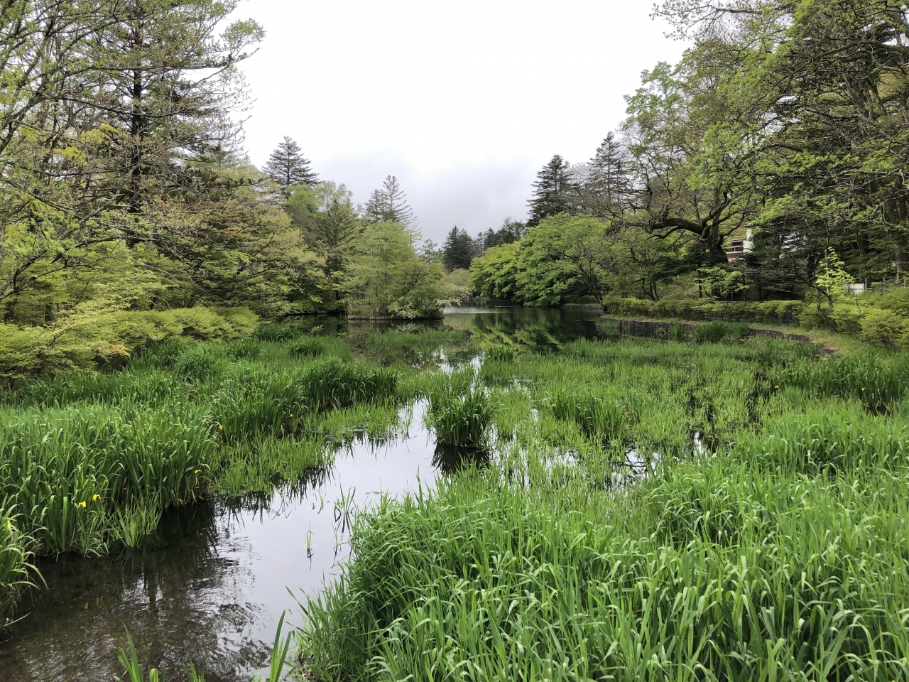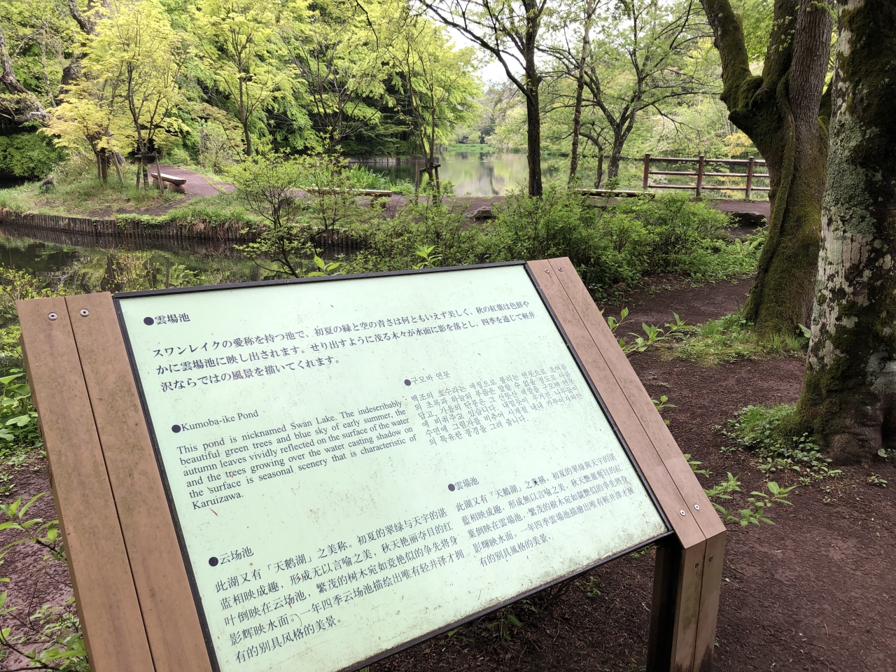 バスの便が悪かったので軽井沢駅からゆっくり歩き20分ほどで到着しました。雲場池までは新緑の道を歩きます。交通量も多くなく別荘地にふさわしい雰囲気があります。到着するとさっそく雲場池の案内板を確認します。池の周囲には遊歩道がめぐらされていてゆっくり歩いても一周20~30分程度です。自分たちは御膳水まで行くために池の途中にある橋を渡らずにそのまま通り抜けました。この橋を渡ると池を一周する遊歩道になります。周辺は熊の出没もあるようなので見通しの悪い所では注意する必要があります。爽やかな新緑の中、楽しく散歩ができる場所です。