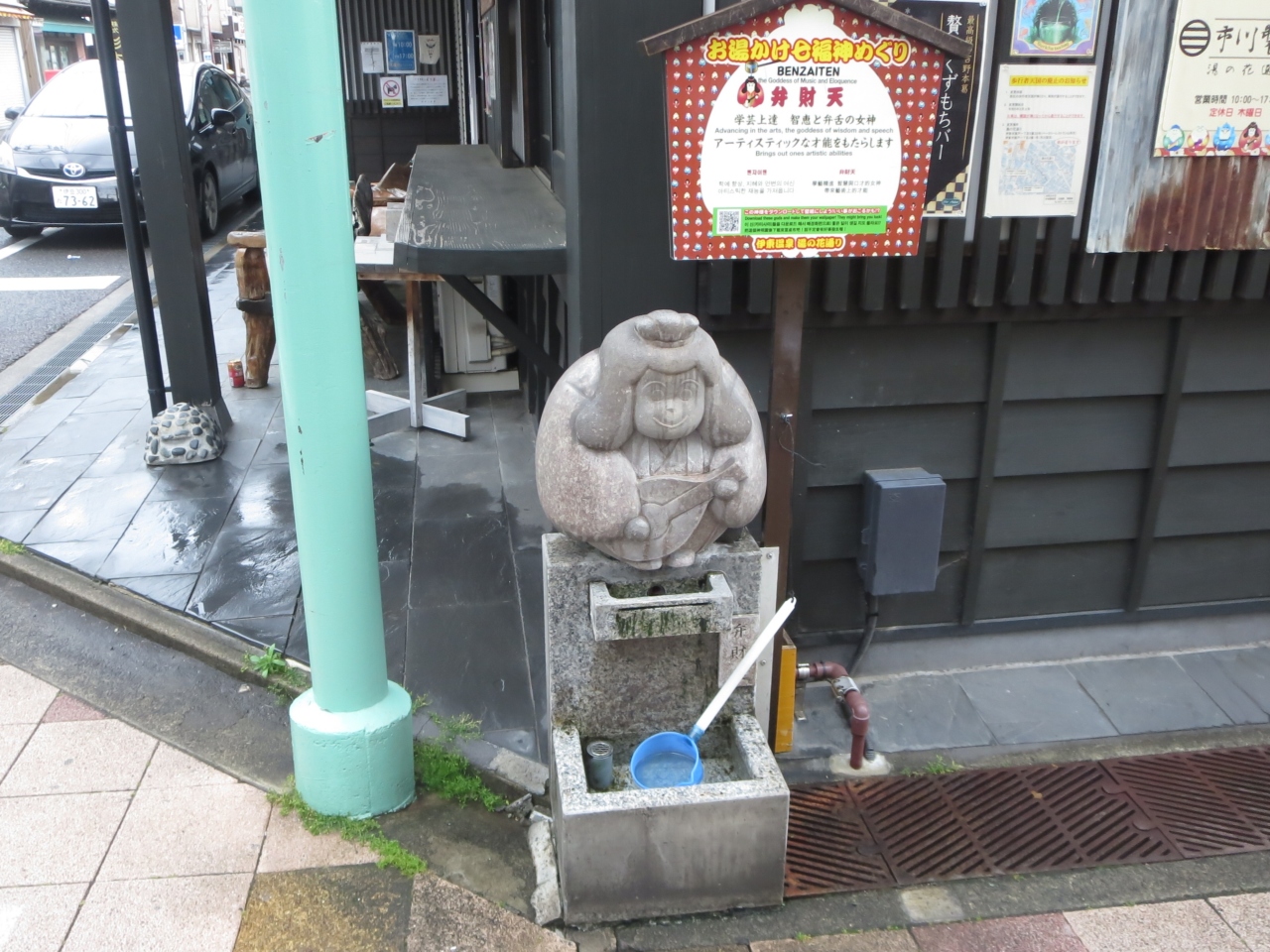 伊東駅から湯の花通りを歩いて最も南側にあるお湯かけ七福神が弁財天です。丸っこい姿をして琵琶を奏でている石像です。愛くるしいお姿でした。学芸上達、知恵と弁舌の女神さんですから、ご利益があるようにしっかりお湯を変えながら願掛けをしました。これで湯の花通りを北から南に歩き、全てのお湯かけ七福神を見たことになります。