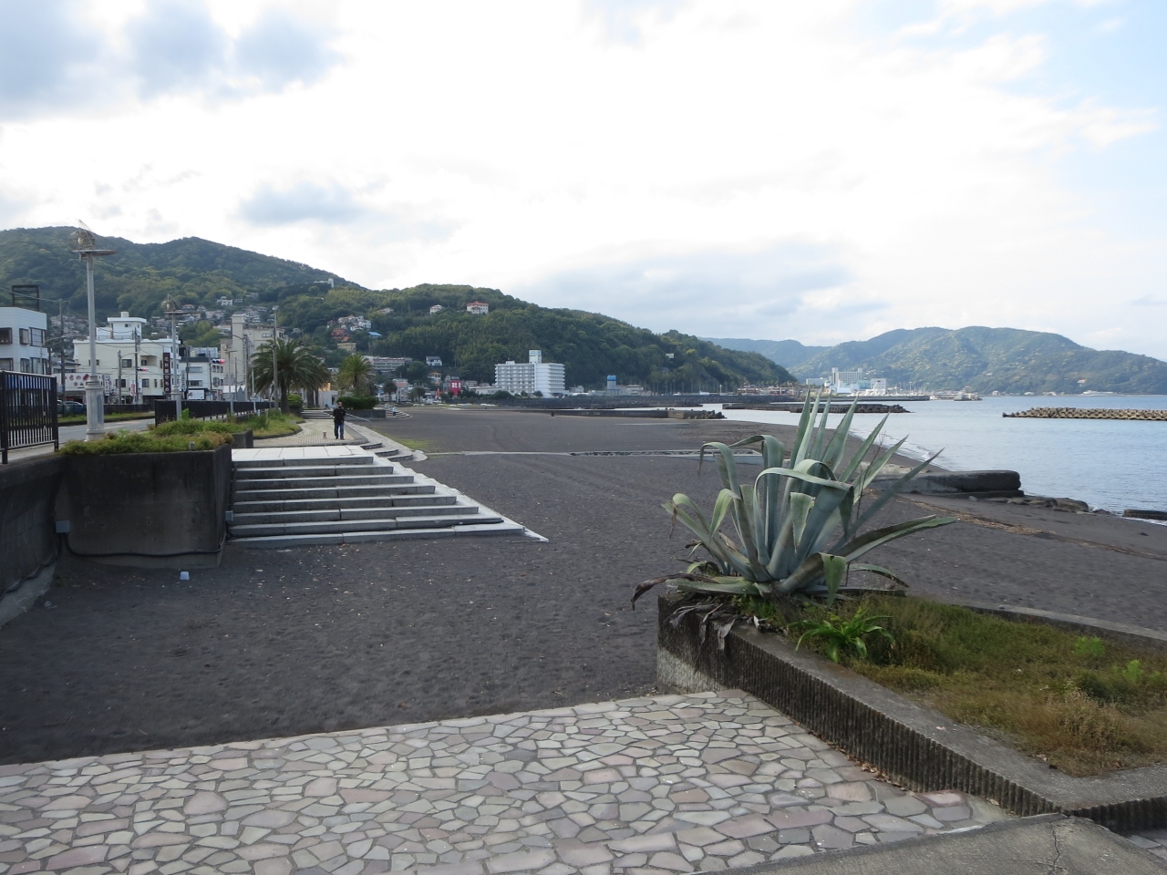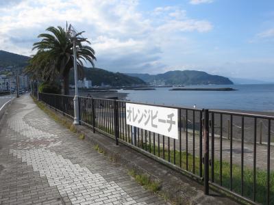 三浦按針の胸像があるなぎさ橋から国道135号線を北に向かって歩き、たくさんの彫刻が並ぶなぎさ公園を過ぎると、その次が伊東オレンジビートです。フェニックスに並木が南国の感じを醸し出しています。さらに海岸線を歩くと遠いですが伊東マリンタウンになります。伊東がみかんの産地だったことから 「オレンジビーチ」と名付けられたそうです。まだ5月でrすので海水浴のオフシーズンですが。ビーチにはちらほらと人影がありました。穏やかな海を眺めながら気持ちがよい散歩ができましたよ。シーズンになると海の家も開設され、宿泊先からでも水着を着たまま海に向かう方がいるそうです。海水浴の後は温泉でしょうかね?