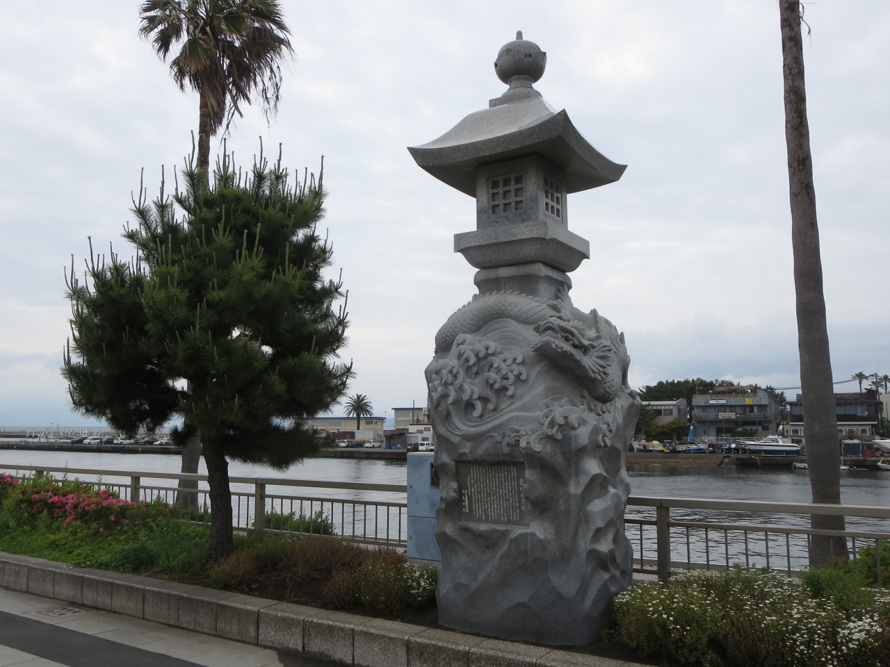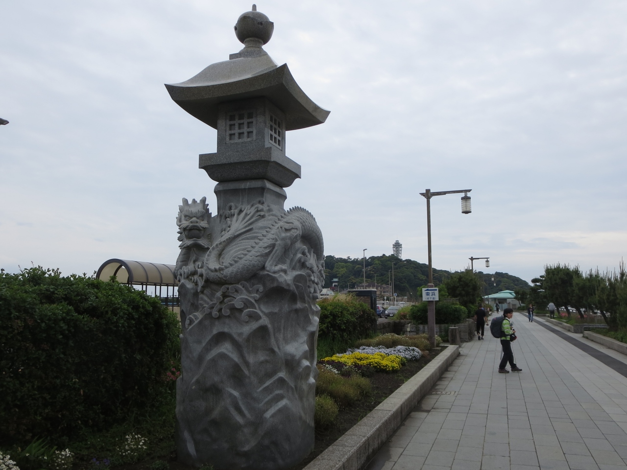 江ノ島弁天橋の途中にある勇壮な竜が彫られた大きな石灯籠です。