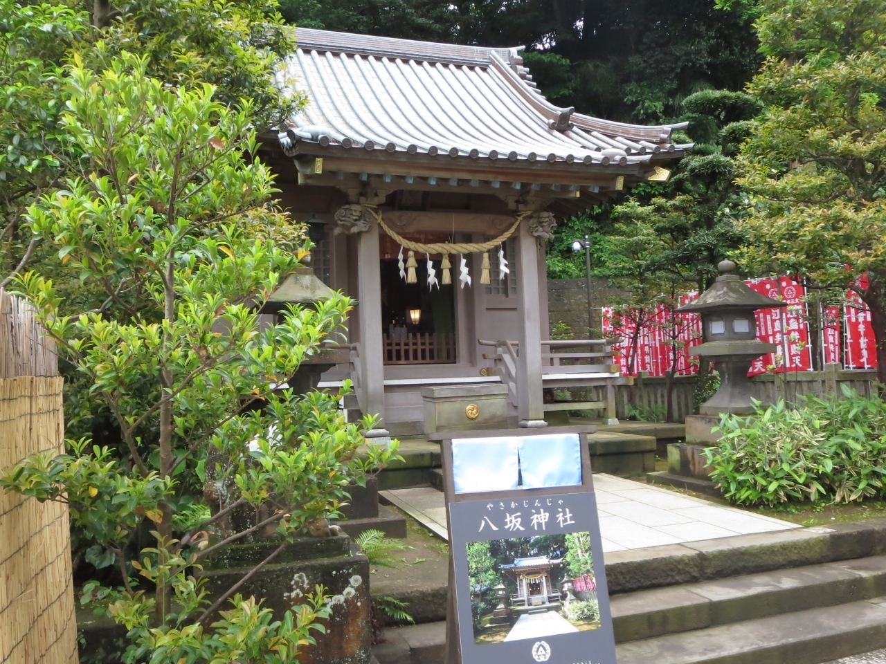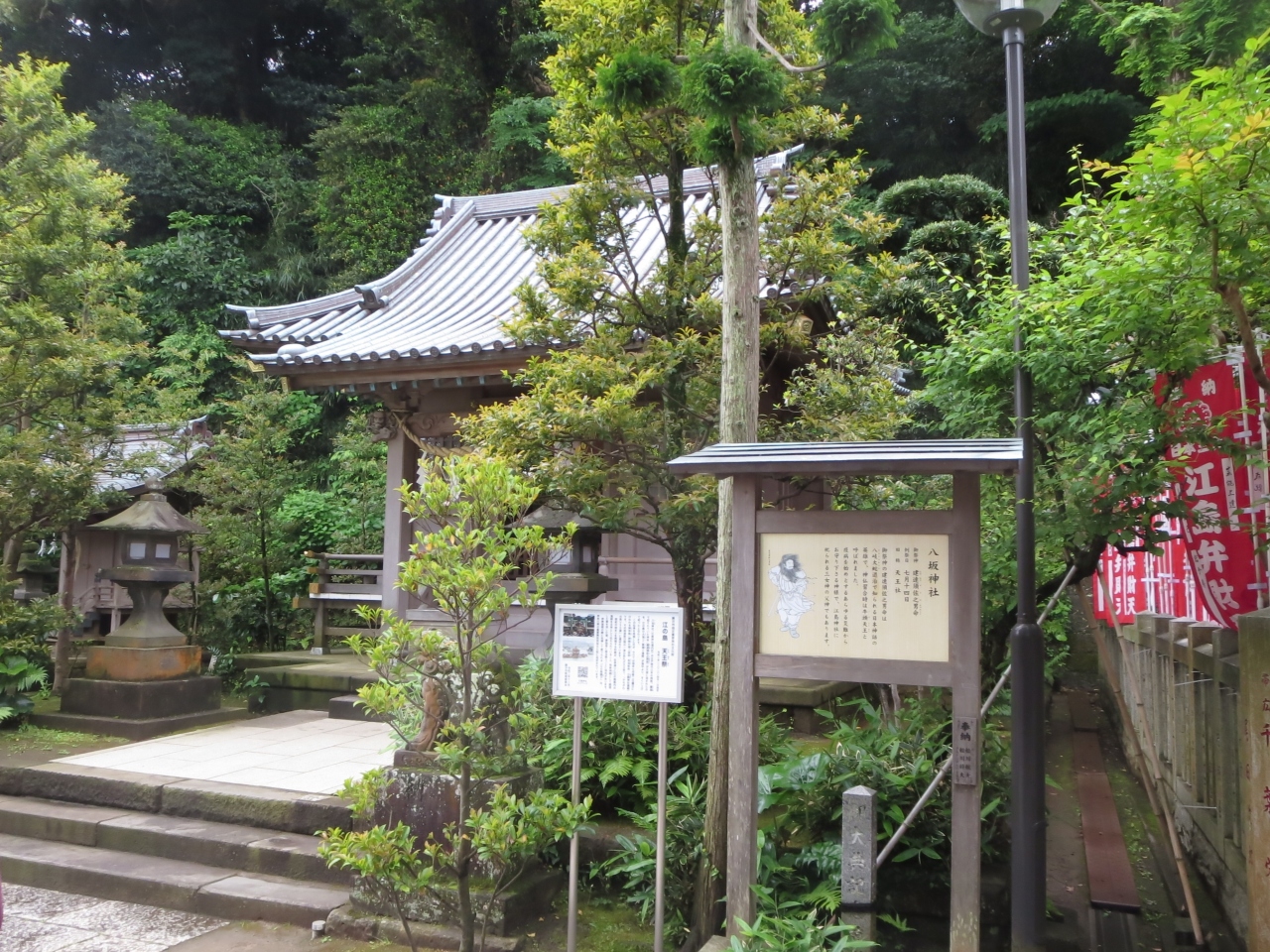 江島神社(辺津宮)拝殿から左手に行くとある江島神社の末社です。腰越にあった小動神社に祀られていた社が大波で壊され、海中に沈んでいたご神体を漁師が拾い、祀ったといわれています。ご神体は天照大神の弟にあたる建速須佐之男命(たけはやすさのおのみこと)が祀られています。この神は疫病や厄災の神様として信仰されています。社殿は1844年に再建ものです。1873年に「八坂神社」と改称され、改築されました。
