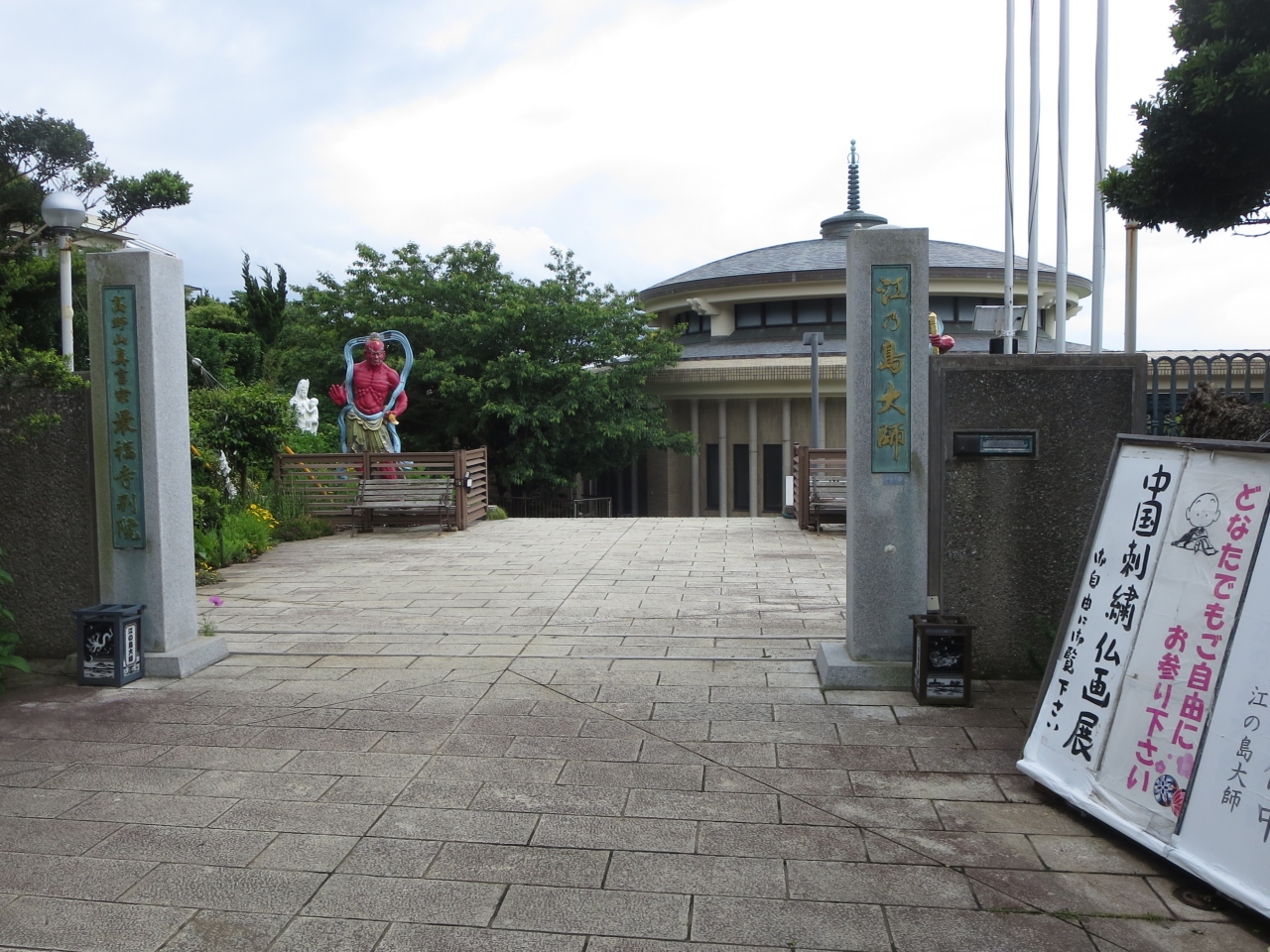 弘法大師が創建した与願寺がかって江の島にありましたが、明治時代も神仏分離令によって廃仏毀釈運動が起こり、仏教建築は破壊されて神道である江島神社のみが残りました。1993年にこの地に鹿児島県最福寺の別院として建てられたのが江の島大師です。真言宗のお寺になります。真っ赤な仁王像が入口の両側にあります。その奥にはお寺とは思えないような近代的な建物が江の島大師本堂になります。本堂内はステンドグラスがあったりしますが、本尊は巨大な赤不動(色落ちしているのかどうかわかりませんが赤くはないです)です。周囲には三十六童子も並んでいます。