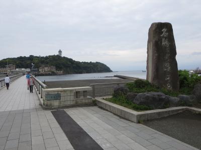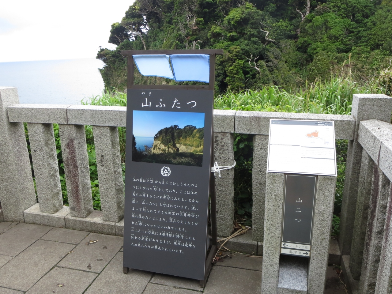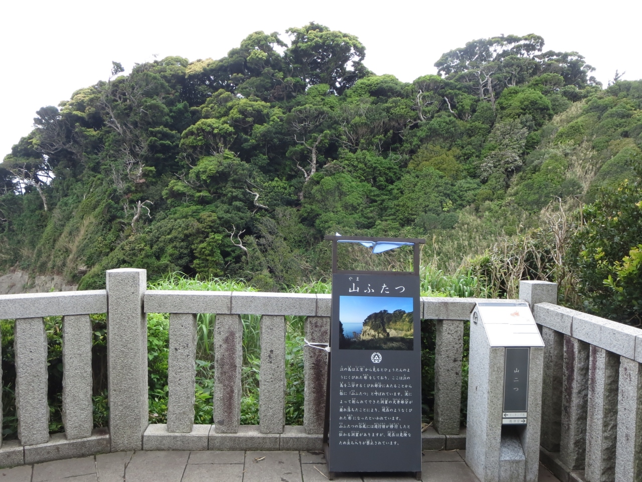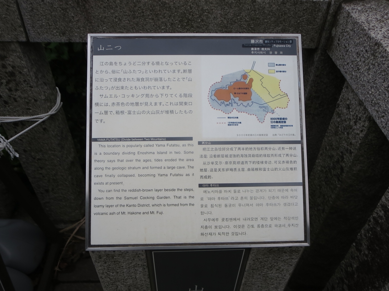 江の島の最高地点付近にあるサムエル・コッキング苑で満開のバラを楽しんだ後、江島神社奥津宮に向かう途中の階段の途中に「山ふたつ」と書かれた碑が建てられています。江の島は空から見るとくびれた形になっていて、その両側から山が迫ってくるように見えるのでこのような名になったのだと思います。階段の途中にちょっとした展望台のようなところがあります。