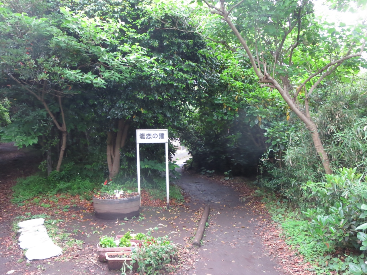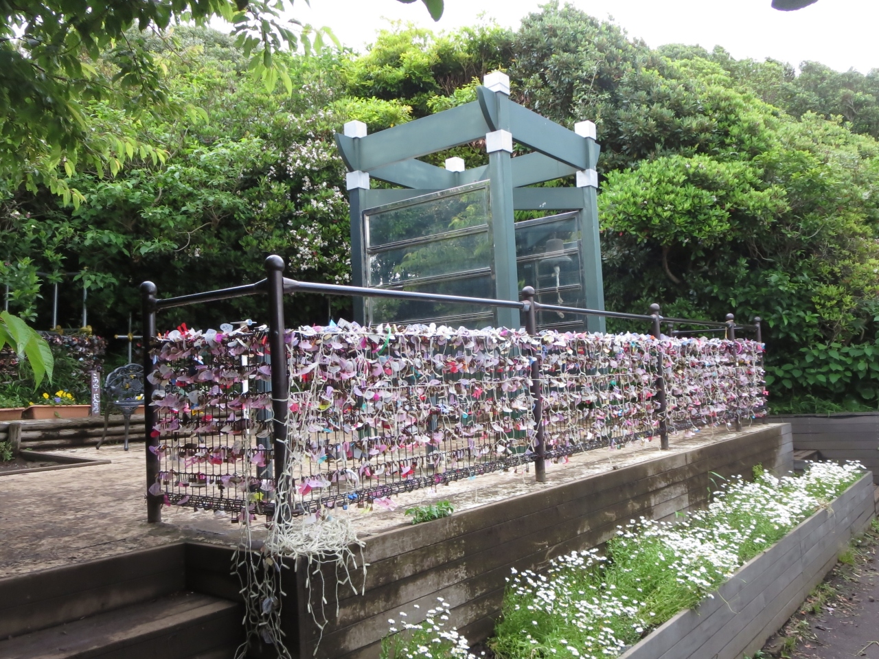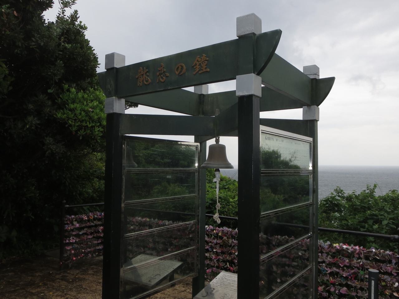 江島神社奥津宮から少し奥にはいいた所から左手に入っていく道があります。しばらく歩くと「龍恋の鐘」があります。江の島に伝わる天女と五頭龍の恋物語をもとに造られたも場所です。その伝説にあやかろうと考えるカップルが訪れる場所です。鐘が吊るされているデッキのフェンスの網にはカラフルな色の南京錠が南京錠がたくさん取り付けてあります。「離れない」ということを表しているのだ思います。そういえばパリに行ったときに「愛の南京錠橋」という橋がありました。恋人たちが名前を書いた南京錠を欄干に取り付け鍵をセーヌ川に投げ永遠の愛を誓うというのがありましたが、洋の東西を問わず同じようなことを考えるものですね。ここからは眺望がすばらしく条件がよければ伊豆大島まで見えるそうです。