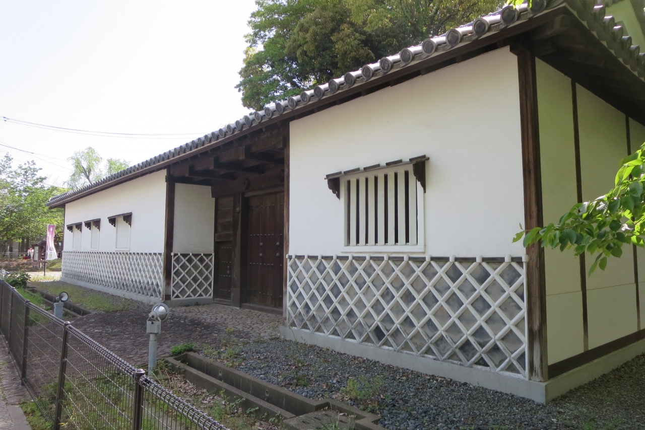 福島正則から名槍日本号を見事に飲み取ったということで黒田節に歌われている母里太兵衛ですが、有名な武将である黒田二十四騎の一人に数えられています。もとは現在の福岡市の中心地である天神の証券界社が集まる場所にあったそうですが、現在の地に移築されています。白漆喰になまこ塀の外観です。いろいろな場所で見かける長屋門と同様に入口の位置が偏っています。この長屋門を使用していたのは使用人などだったと思います。