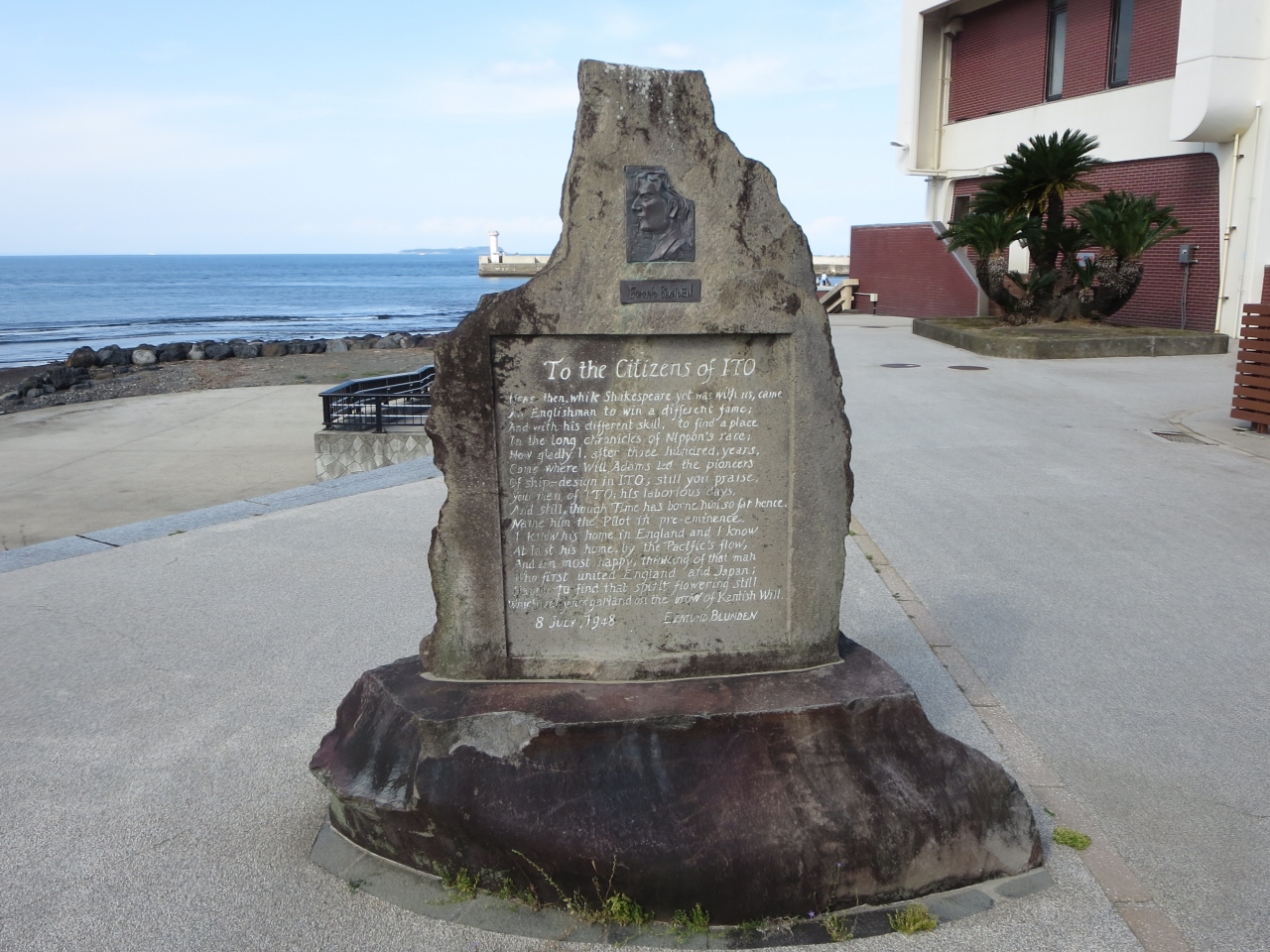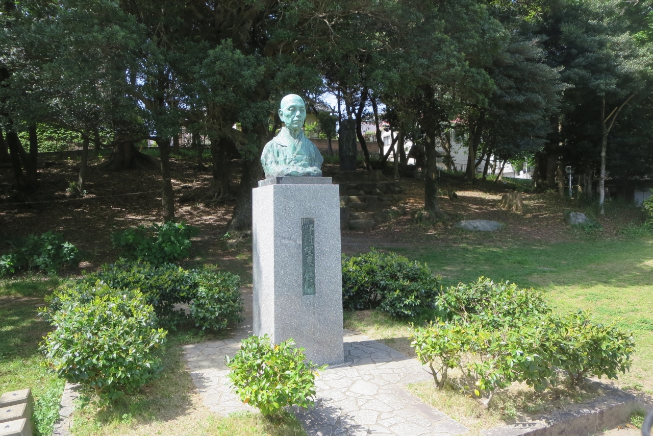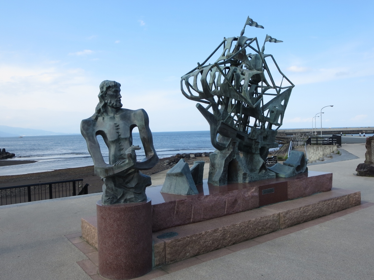 伊東の温泉街を北から南方向に流れる松川の河口、国道沿いにあるのが按針メモリアルパークです。なぎさ橋の南側になります。英国人航海士ウィリアム・アダムスは1600年にオランダ船リーフデ号で現在の大分に漂着しました。徳川家康の外交顧問とります。彼を記念した小さな公園です。彼の胸像と、按針により伊東で建造されたサン・ブエナ・ベントゥーラ号(80t)の彫刻があります。