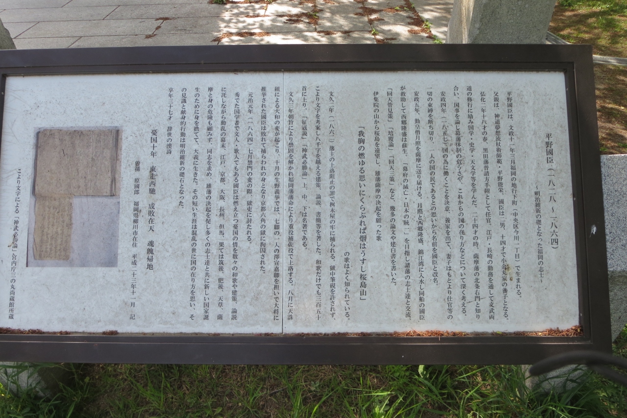 幕末の福岡藩は佐幕派が多く、平野國臣は福岡藩にあっては数少ない尊王攘夷派の志士でした。倒幕論を広め寺田屋騒動で投獄された後、八月十八日の政変でも挫折します。天誅組の挙兵に呼応する形で但馬の行くので挙兵しますが失敗し投獄されます。京都の六角獄舎に投獄されていましたが、禁門の変で起きた火災に乗じ殺害された人物です。