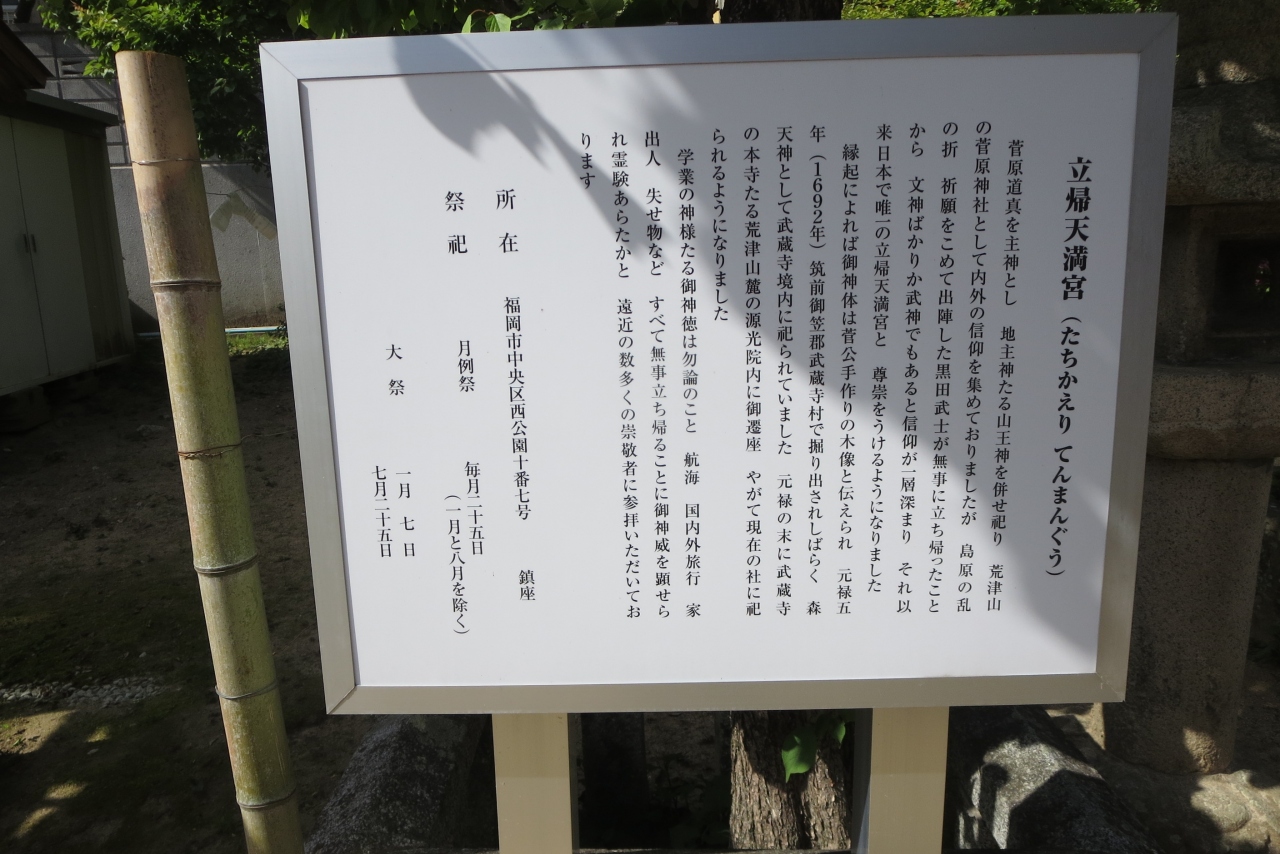 黒岳ゆかりの光雲神社のすぐ手前にあります。参道から左手に少し階段を下りた所にある小さな神社です。武蔵寺(福岡県筑紫野市)に祀られていたご本尊は江戸時代にこの地に移されています。島原の乱(1637年)に出陣する福岡藩藩士が参拝し、無事に福岡に帰ってきたことから「帰ってくる」というご利益があるとして信仰が集まりました。転じて、海上交通の安全祈願も行われるようになったyプです。