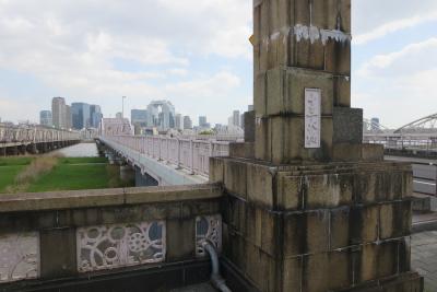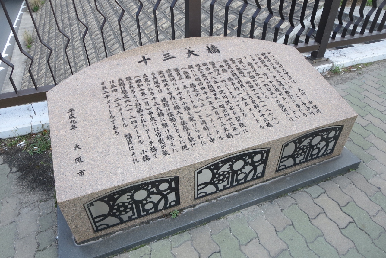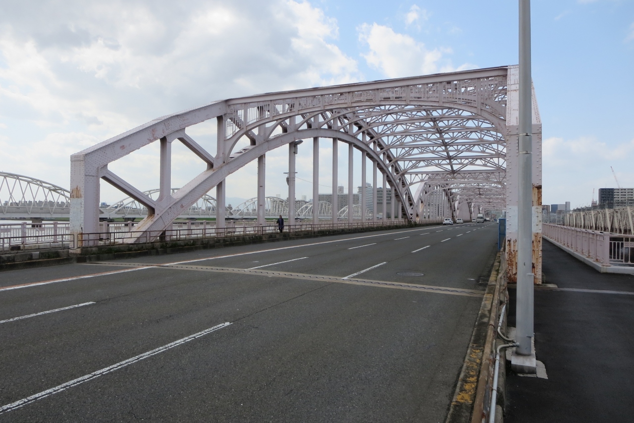 ここに初めて橋が架けられたのは明治11年です。そのフォ鉄橋になったりしているようですが、現在の橋は昭和7年に完成したもので、5連のアーチが形よく並ぶ橋で、国道176号線になっています。橋を渡って歩いていると、大阪市内方向は3車線あるのに郊外に向かう方向は1車線です。不思議に思って調べてみると、すぐ下流に新十三大橋が架けられて、郊外に向かう車はこの橋を利用しているようです。橋の建設当時は路面電車を走らせる予定もあったようです。すぐ上流側には阪急電車の京都線、宝塚線、神戸線の鉄橋がありますので、電車ファンにはたまらないスポットの入なっているようです。
