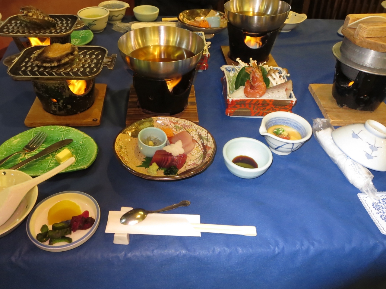伊東駅から荷物を持って歩くのは大変かなと思います。今回は車利用でした。前面の国道を挟んだところに駐車場ありますので、荷物の多い人は一度ホテルの前で荷物を下ろして駐車場に向かうのがよいと思います。ホテル内の設備はやや古さを感じますが、清掃はしっかりできているので不快な感じはないです。部屋はツインベッドに和室6畳、キッチンもありますので、長期滞在者には便利かもしれません。トイレ、部屋のお風呂は独立したものです。地下にある温泉は3m四方位の浴槽です。7~8人程度入れば狭く感じるかもです。洗い場も10人分はないです。翌日には男女お風呂は入れ替えになるのですが、そちらには入っていませんので様子は分かりません。食事は伊東らしく魚介類中心のものです。鮑の踊り食い、刺身、鍋、煮魚、野菜天ぷら、山菜釜飯、味噌汁(関西人に自分には飲めない味でした)、などでした。もう少しボリューム感があってもよいかと思います。朝食の方が自分はお気に入りです。自分で干物類を取って焼くので、熱いまま食べることができます。その他はバイキングのような感じですが、品数も豊富で満足できました。