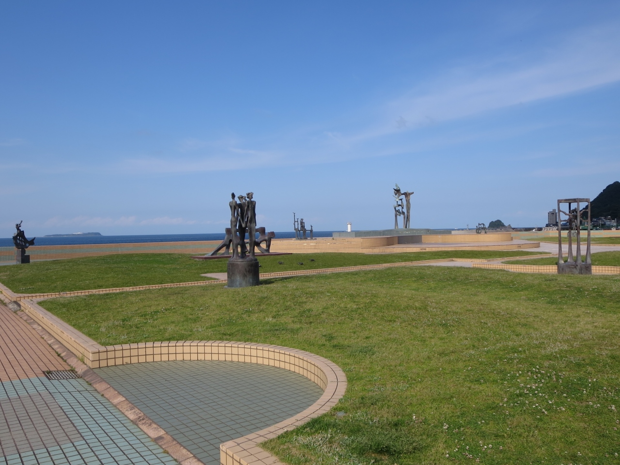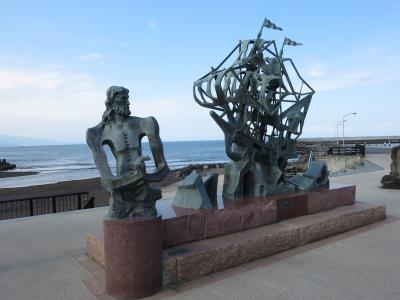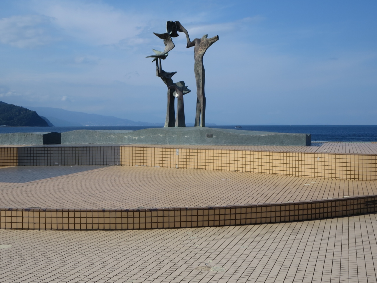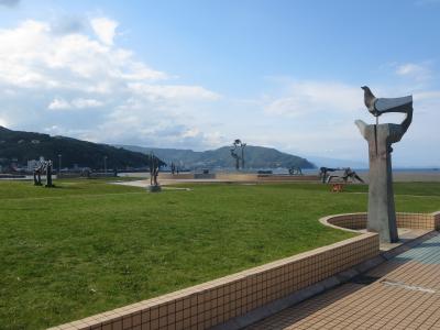 伊東市制30周年を記念した事業で、1977年に整備された公園です。国道と海の間にあり、地元彫刻家である重岡建治氏の彫刻が並んでいます。平和や幸せを求める伊東市民をモチーフにしているようです。海岸線に立ってみると、房総半島、三浦半島、真鶴岬、初島などが一望できると書かれていましたが、天候に恵まれてはいましたが全てを望むことはできませんでした。