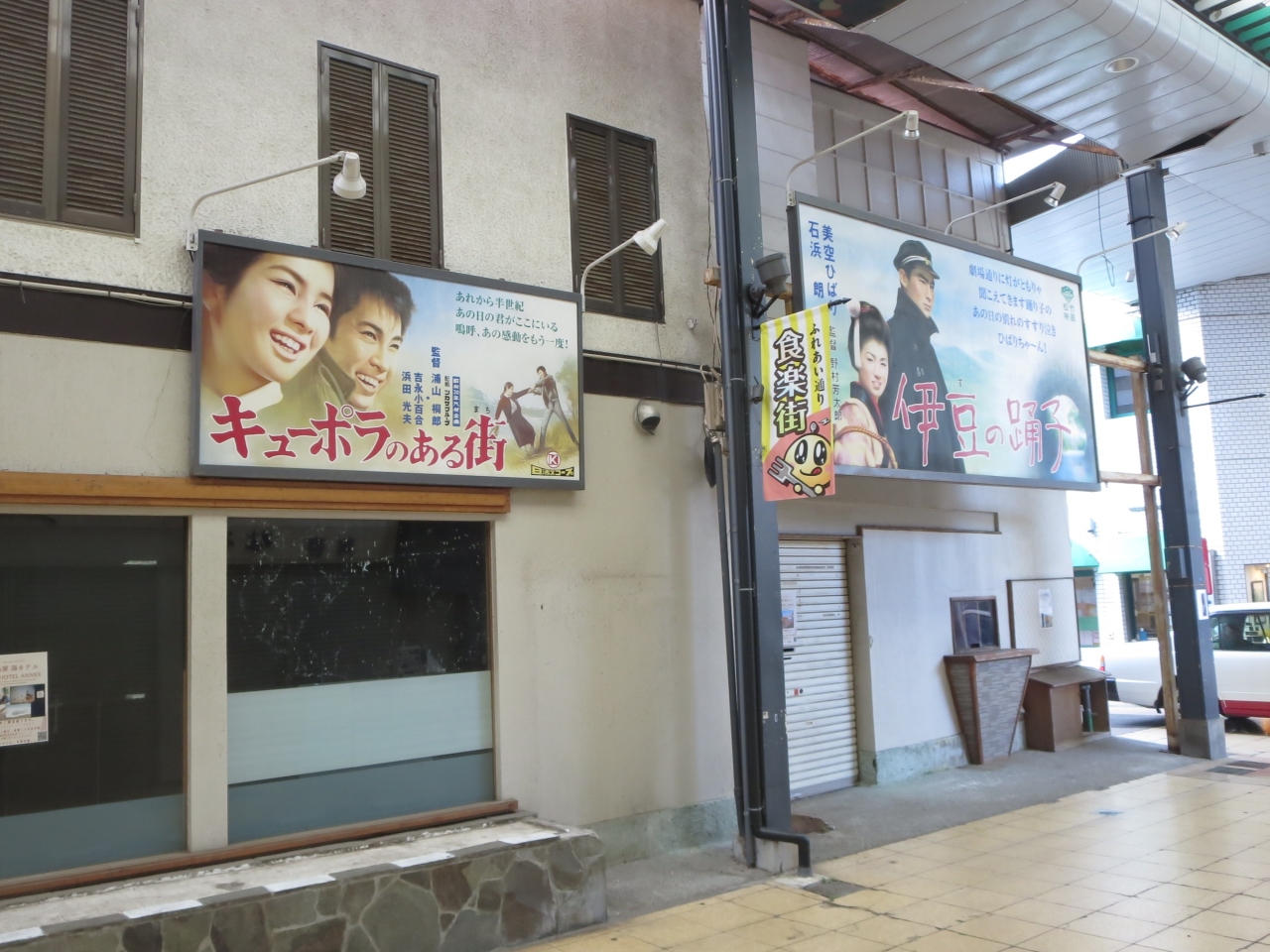 伊東駅から右手前方にある湯の花通りを歩き、猪戸通りを過ぎるとキネマ通りがあります。ここから約200mほどのアーケードがある商店街です。「キネマ通り」という名称は、戦前あった映画館「キネマホール」にちなんで名付けられたものです。中央商店街と交差点にはちょっとレトロ感のある映画館?があり、壁には「キューポラのある街」「伊豆の踊子」の映画看板が掲げられていました。こういう手書きの映画ポスターは懐かしくもあり、味がありますね。