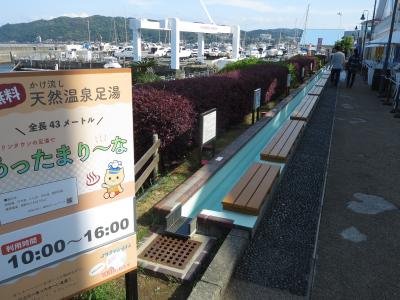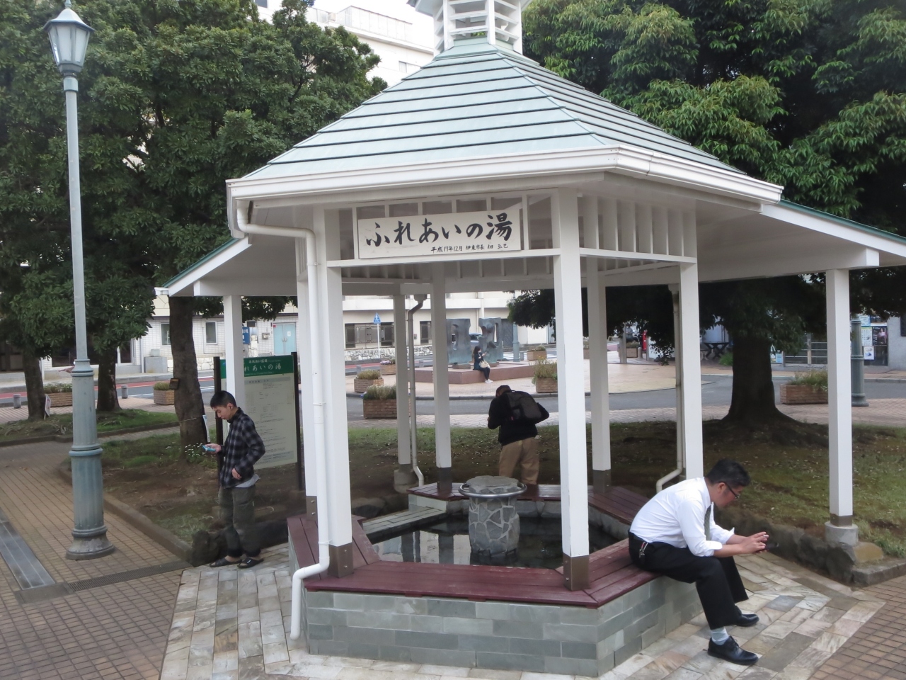 伊東温泉に宿泊したときに、ホテルにチェックインした後、夕食時間前に街を散歩しました。キネマ通りを抜けた時にたまたま見つけたのがこの足湯でした。街の一角にある松川公園の隅に白い建物があります。この中に足湯があります。足湯を囲むように六角形の座席があります。大きなものではなく10人も同時に足をお湯に入れたら満席になります。歩き疲れた時にはよいかもしれません。