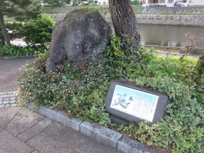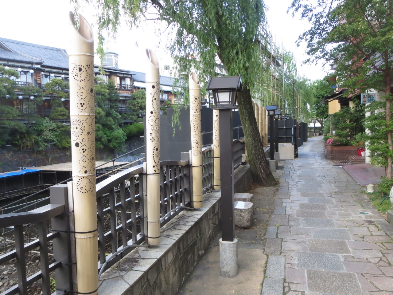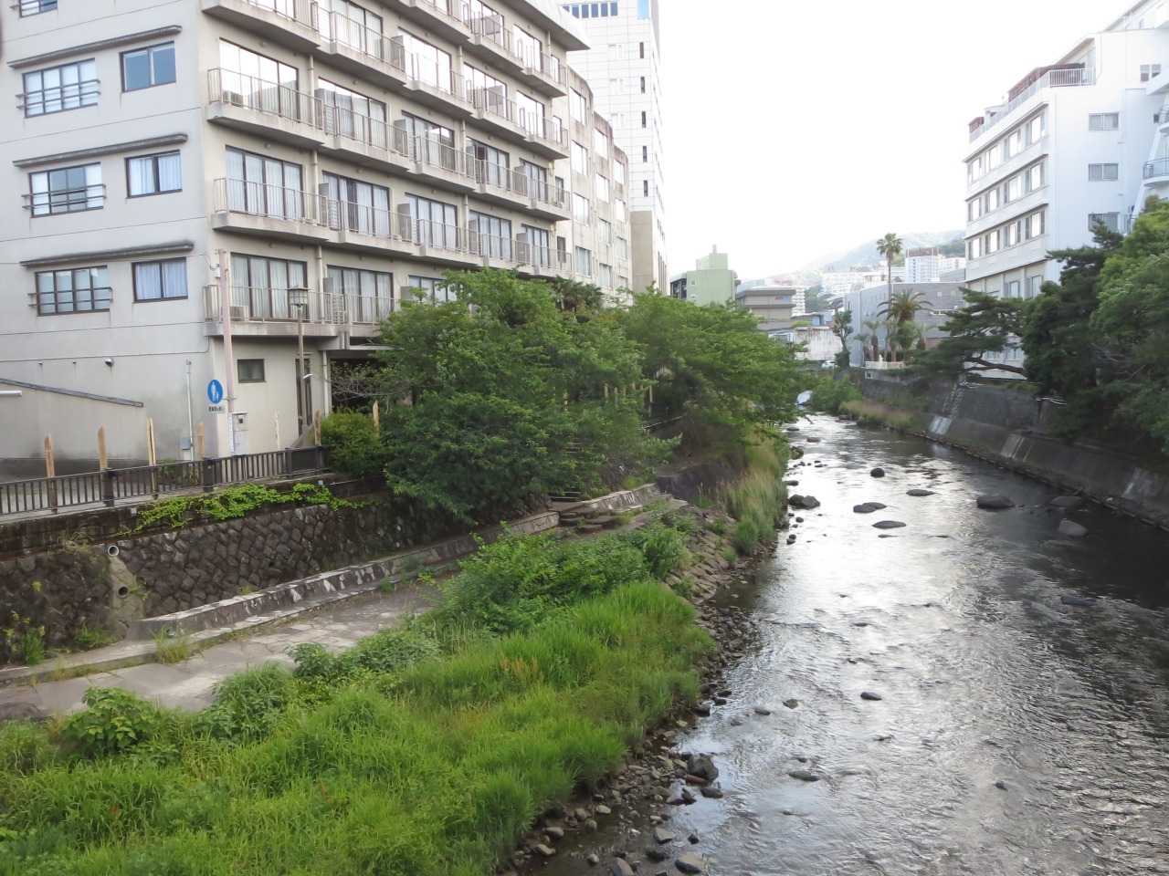 伊東駅→湯の町通り→キネマ通りを抜けて、松川に架かる「いでゆ橋」を渡ります。この橋の上流から海まで、松川の右岸に沿って遊歩道があります。桜並木があるので春は桜を見ながら散策できるでしょうね。新緑に誘われるようにして、石畳になっている小径を歩いてみました。静岡県まちなみ50選に選ばれたらしく、風情のある道です。川の反対側には東海館がよく見えます。小径には竹を加工したランタンがあるので、夜はこの灯に照らされた道はロマンチックになると思います。