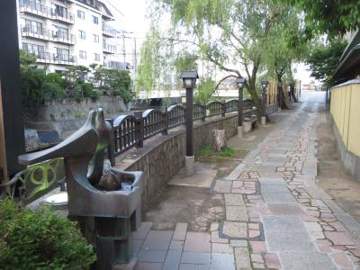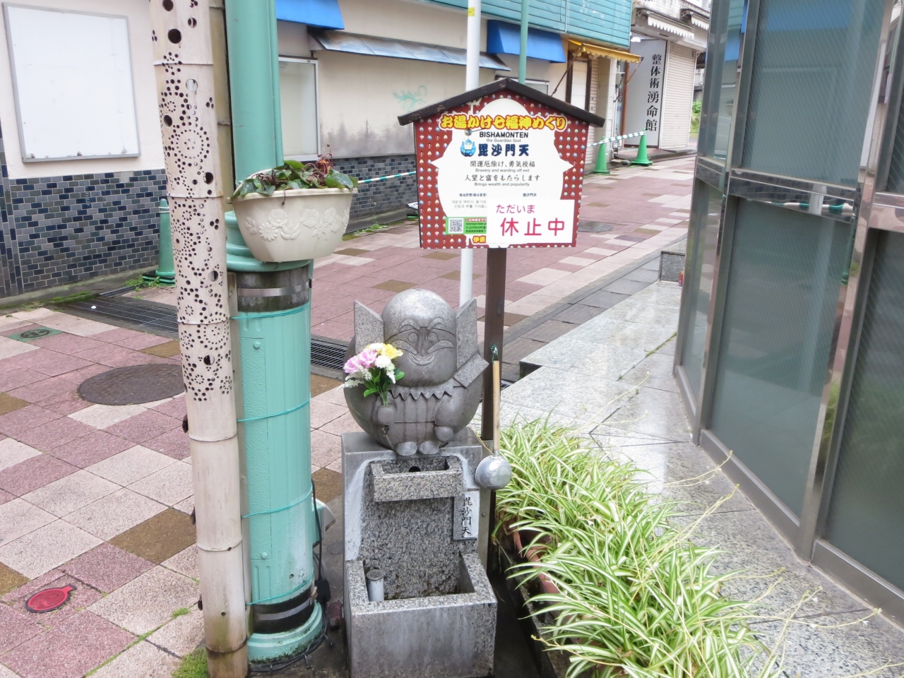 お湯かけ七福神は伊東駅から右前方に進んだところにある湯の花通りとその脇道に点在しています。訪れて残念だったのは「休止中」の張り紙があったことです。休止の理由も書いていなかったので、ますます残念でした。毘沙門天は上杉謙信も信仰した戦いの神様ですから、どんな感じかと思ったのですが、かわいらしい感じにできていました花を右手に持っていてアニメ版毘沙門天でした。足元に湯が出ているはずなのに・・・と思いながら後にしました。