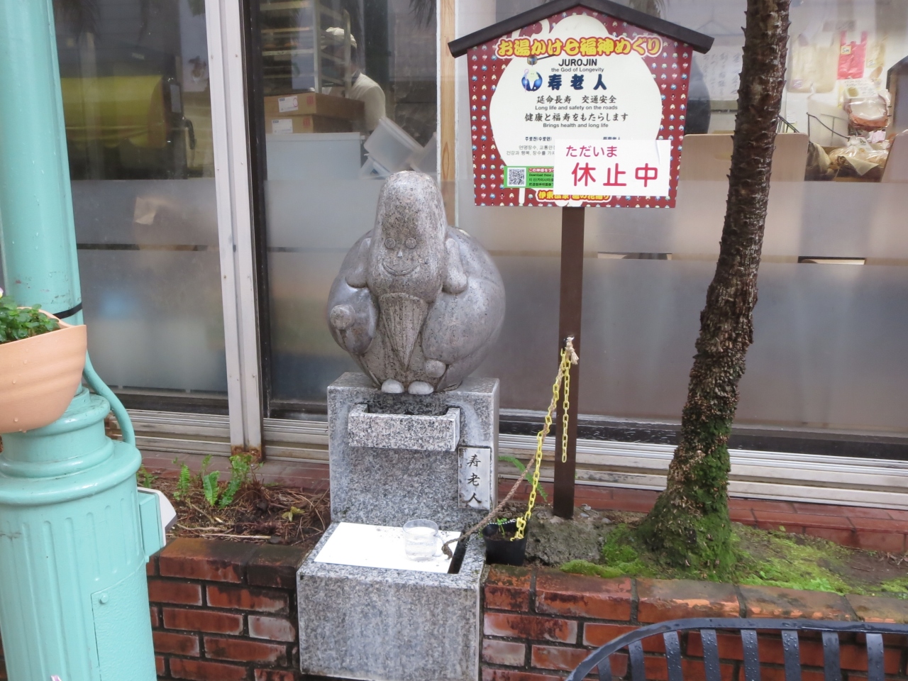 お湯かけ七福神は伊東駅前から右前方にある湯の花通りとその裏道に点在しています。湯の花商店街の最も北側にあって、伊東駅から歩くと商店街の入口、パン屋さんの横にあります。ここからは土産物を物色しながら商店街を抜けていくことになります。残念ながら、訪れた時には「温泉が休止中」と張り紙がしてありました。せっかくなのに温泉に手を浸しながら歩こうとしていたのに残念でした。寿老人は長寿の神様なのにご利益がないかもしれません。