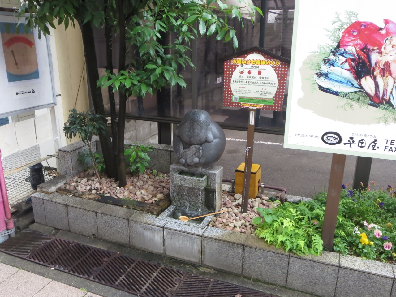 伊東駅からすぐ近くにある湯の花通りは、お湯かけ七福神があります。地図をもとに湯の花通りとその裏道に点在する七福神のうち布袋尊を見に行きました。毘沙門天と寿老人は温泉休止中と張り紙があったので、今度こそという気持ちで探しました。布袋尊はコミカルな感じに仕上がっていて、穏やかな表情をされていました。今回は温泉も出ていました。さっそくお湯をかけてお願い事をしました。布袋尊は縁談、商談成就、愛敬蓄財の神、未来を予見し、事業の成功、人の輪に導いてくれるので、きっとご利益があると思います。