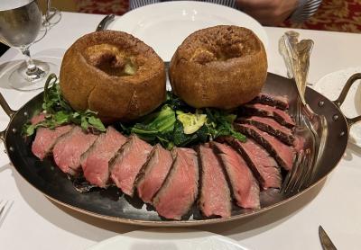 ローストビーフ(2名分から注文可)とお水をオーダー。提供までに時間がかかるため前菜を頼めば良かったかな。ローストビーフは見映え抜群で美味しかったです。付け合わせのヨークシャープディングは少し焦げ目のあるシュー生地みたいでお肉によく合いました。お会計にはサービス料が含まれてたのでチップは必要無し。2人で2万越えでしたが、奮発した価値はありました。