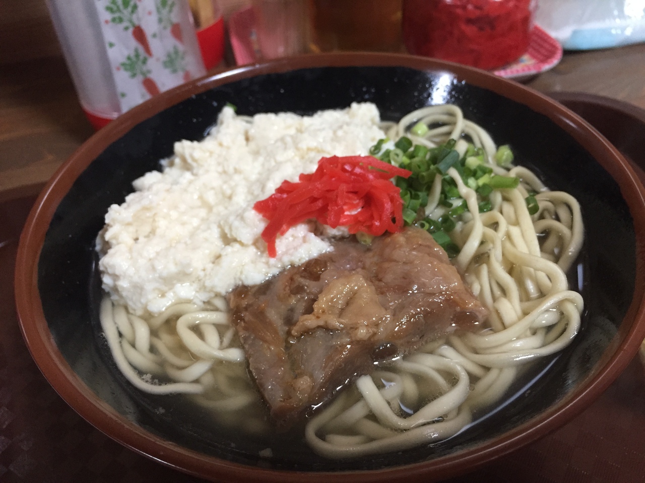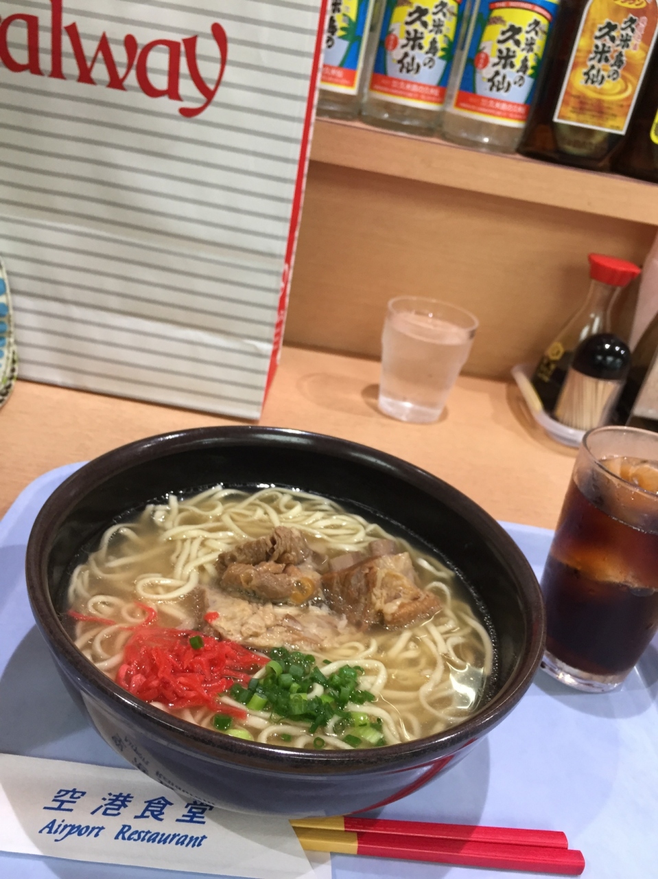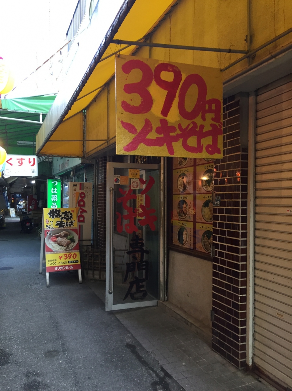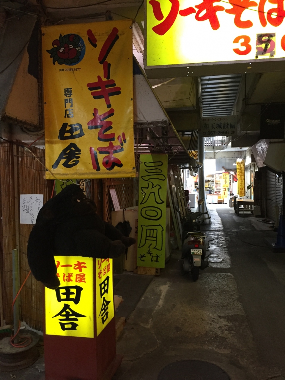 確かに牧志そばと名前が変わっていました。国際通りから市場本通りを入って奥を曲がったところにあり、看板にソーキそば390円と大きく書かれています。ゆし豆腐そばを注文。食券を買ってお兄さんに渡して席を決めて振り返ったら、もう出来ていました。安い!早い!でも味は普通でした。奇しくも翌日行った泊港から北に歩いたところにある「田舎」のソーキそばのほうが、びっくりするほど美味しかったです。前のお店と関係あるのかな。