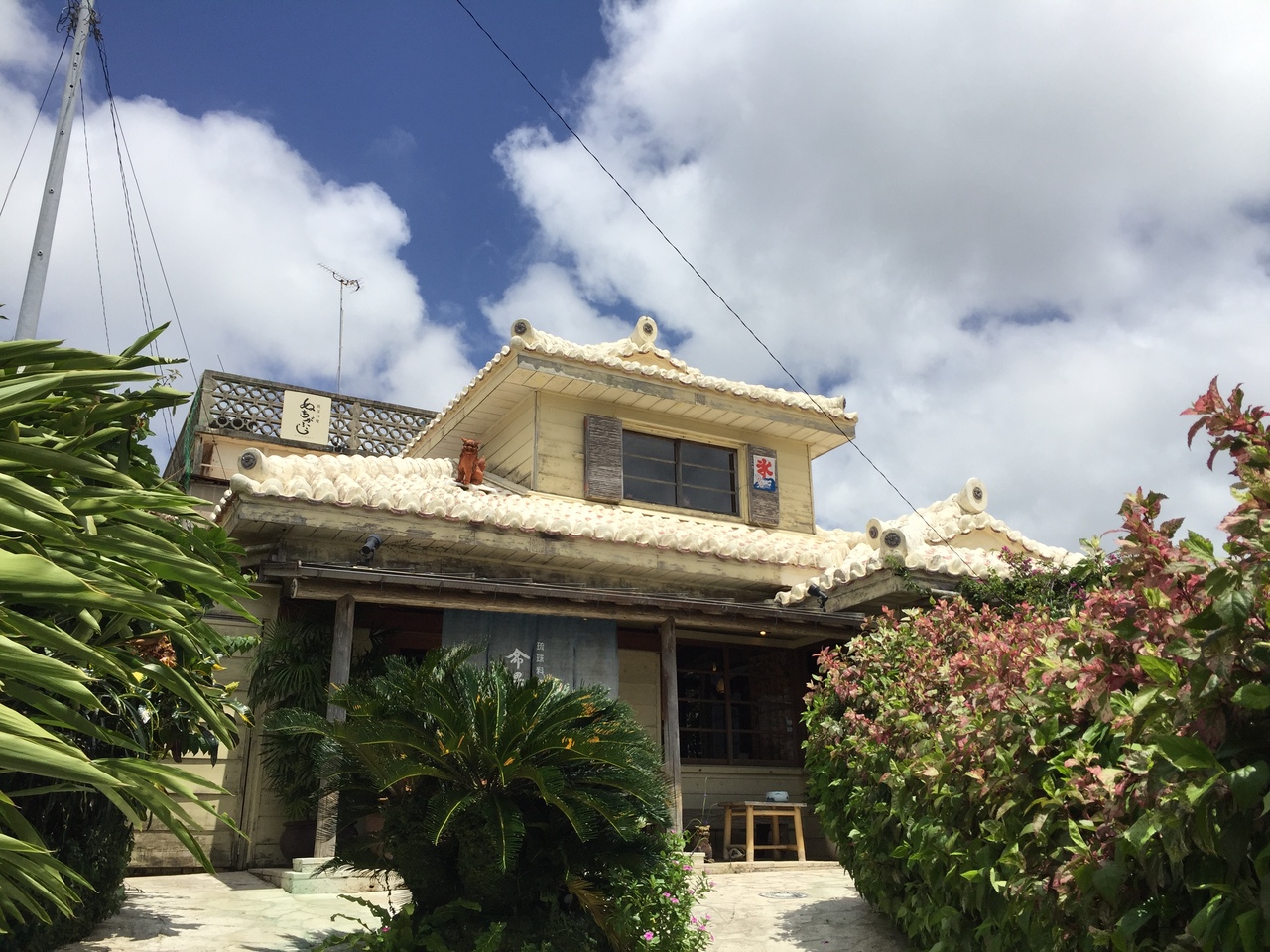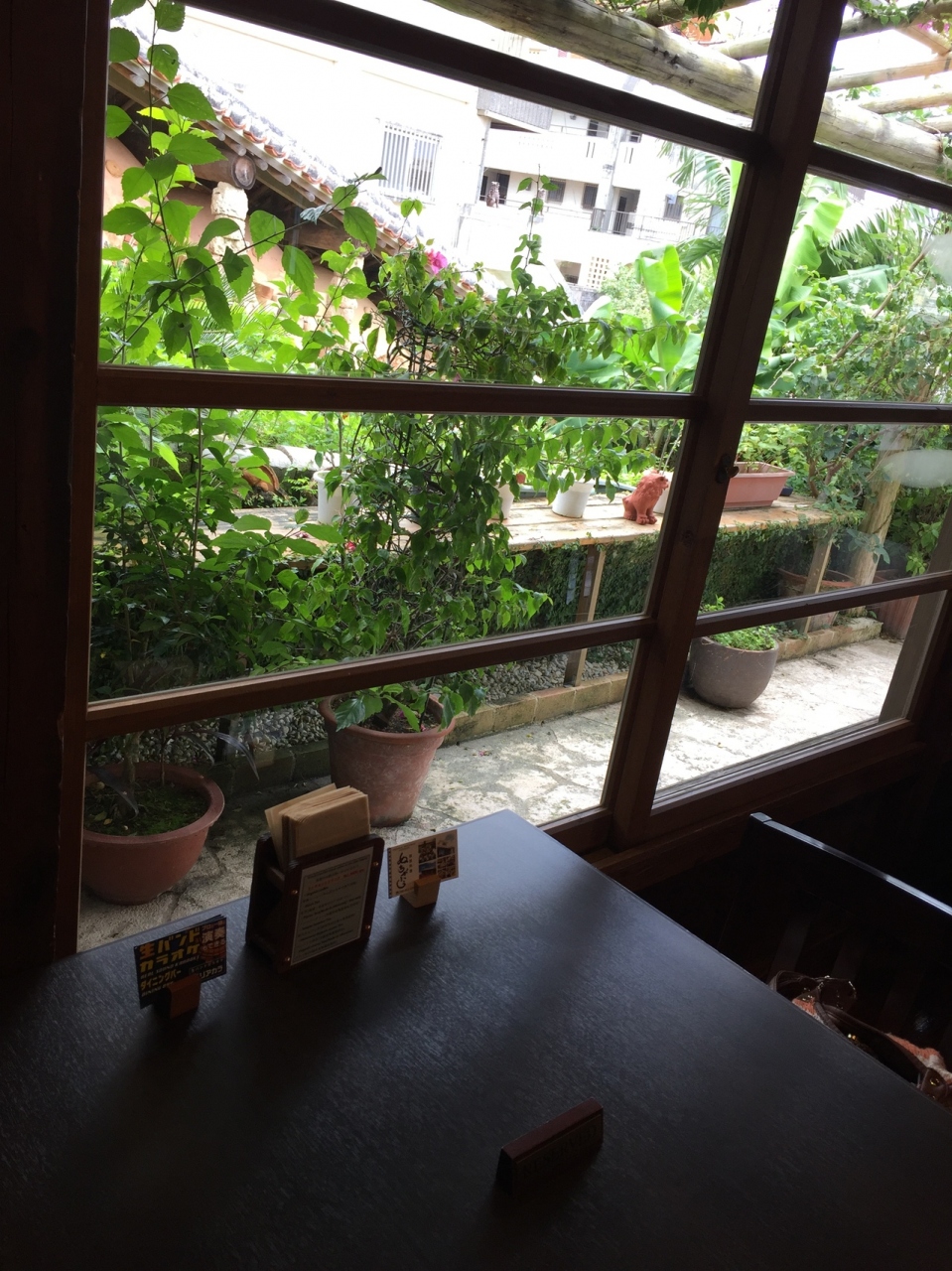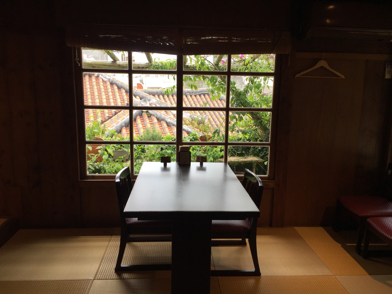 壺屋やちむん通りを新垣住宅の方へ曲がって少し上がったところに入口があります。エントランスから緑がいっぱい。旧ラジオ局であった古民家をリノベーションした白い建物。店内とても落ち着いた雰囲気で、窓からは国の重要文化財である新垣住宅の赤瓦や登窯の東ヌ窯が見えます。
