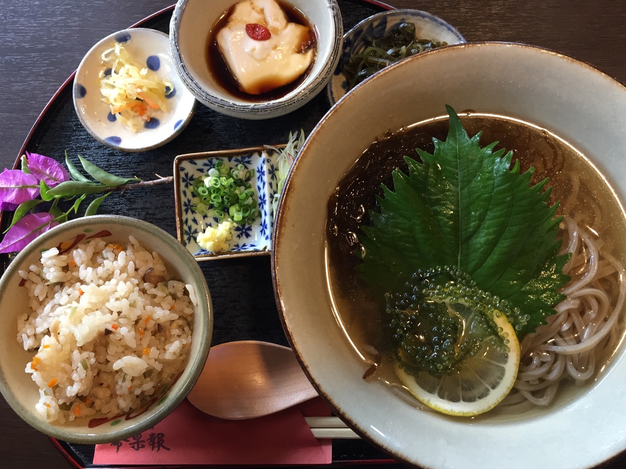 ぬちがふぅ御膳を頂こうと思っていましたが、夏の暑い時期だったので、10食限定の夏季限定冷やしすばセット(伊平屋島もずく麺)にしました。これがまた最高に美味しかった♪ジューシーやジーマミー豆腐もついてました。