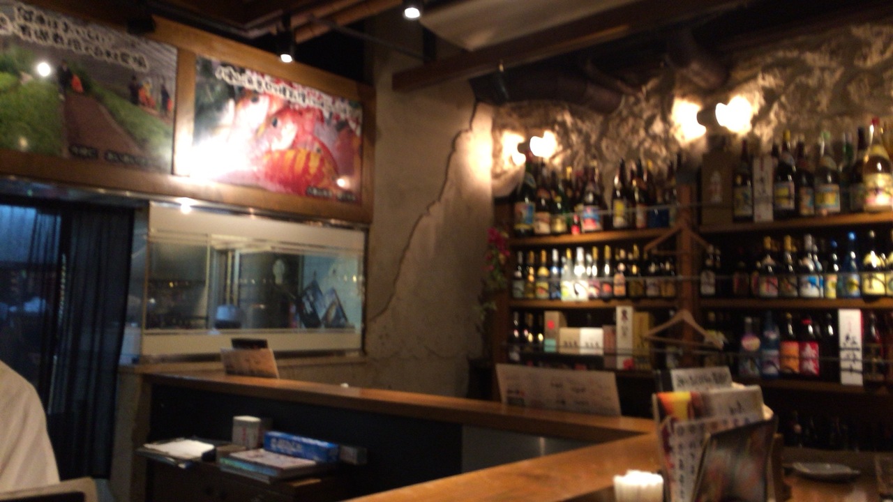 店内奥の席の板前さんの周りを囲むカウンター席に通されました。壁面にはお酒(泡盛)がたくさん並んでいて、きれいでゆったりとした店内。メニューに悩んでいたら「どのメニューもハーフに出来ますよ」とのこと。おひとりさまにはとてもありがたいです!