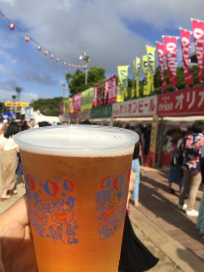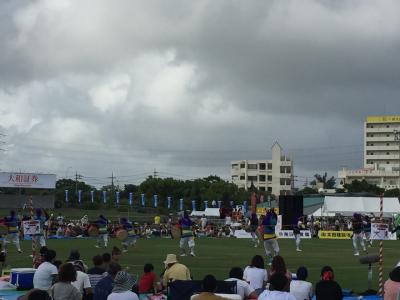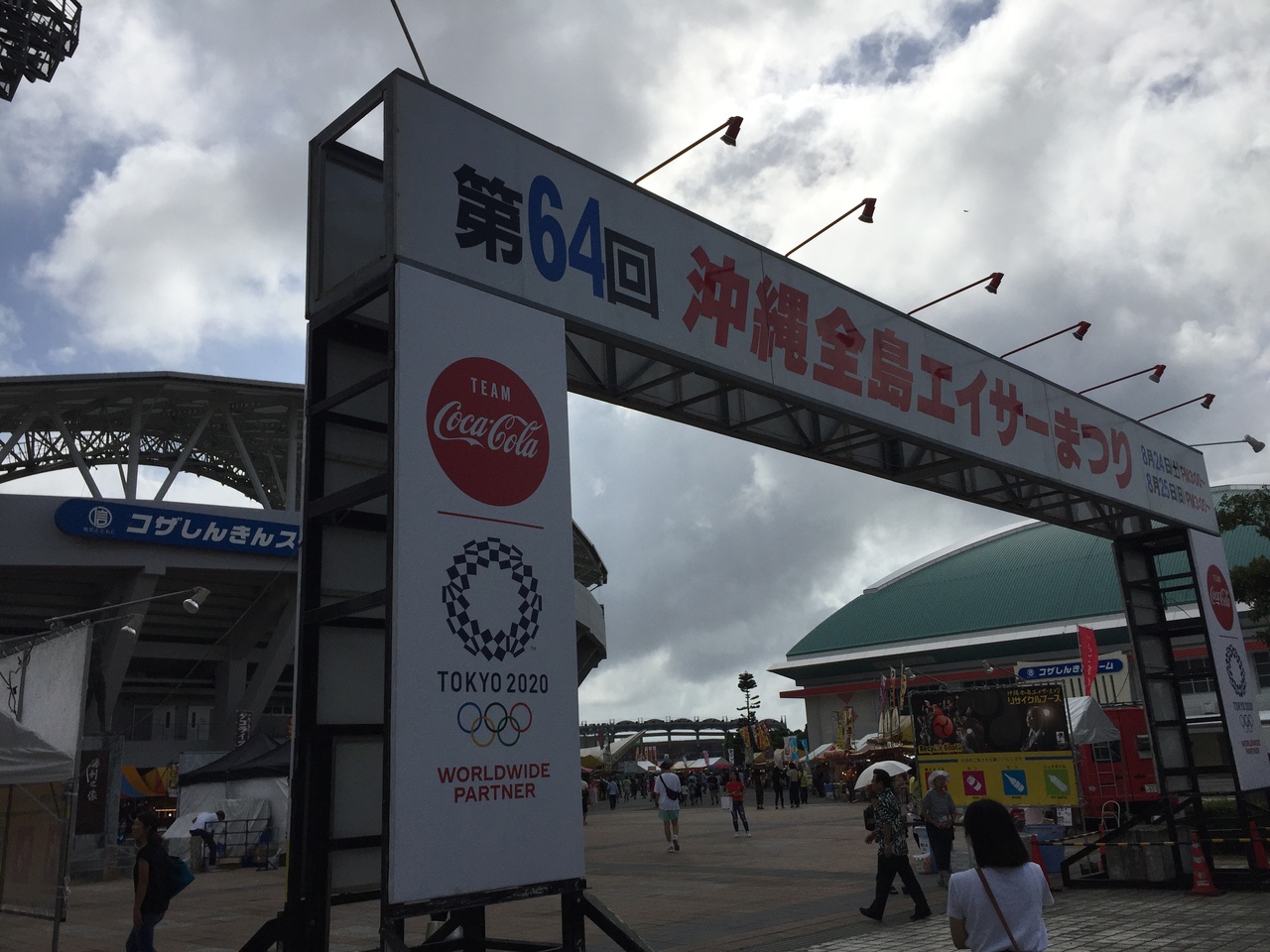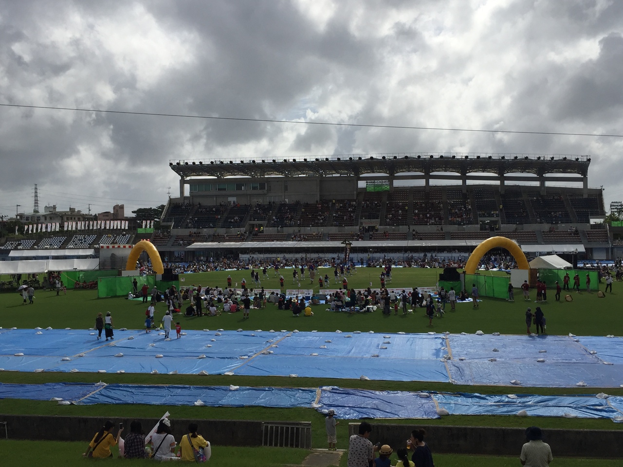 コザ方面行きの路線バスで園田で降りて徒歩15分ほど。夏の終わりに行われる全島エイサーの会場でした。アリーナの前方が舞台で、それを取り囲むように観客がシートをひいて陣取って見ています。スタンド席のみ有料でした。開始時間(3時)ごろはそれほど多くなかった観客も、夜にはアリーナやその周りの芝生も人で埋め尽くされていました。隣の会場ではオリオンビアフェストが行われていました。イベント締めには花火が打ち上げられ、とても盛り上がっていました。