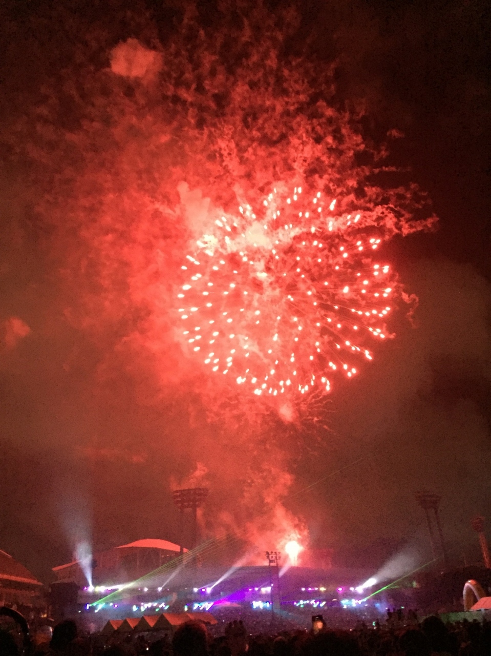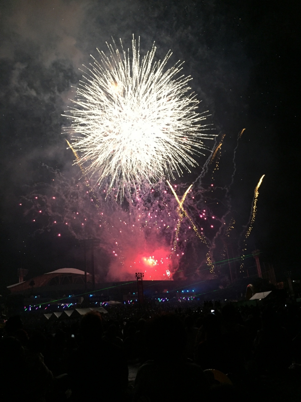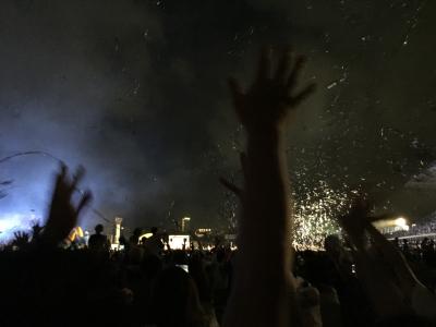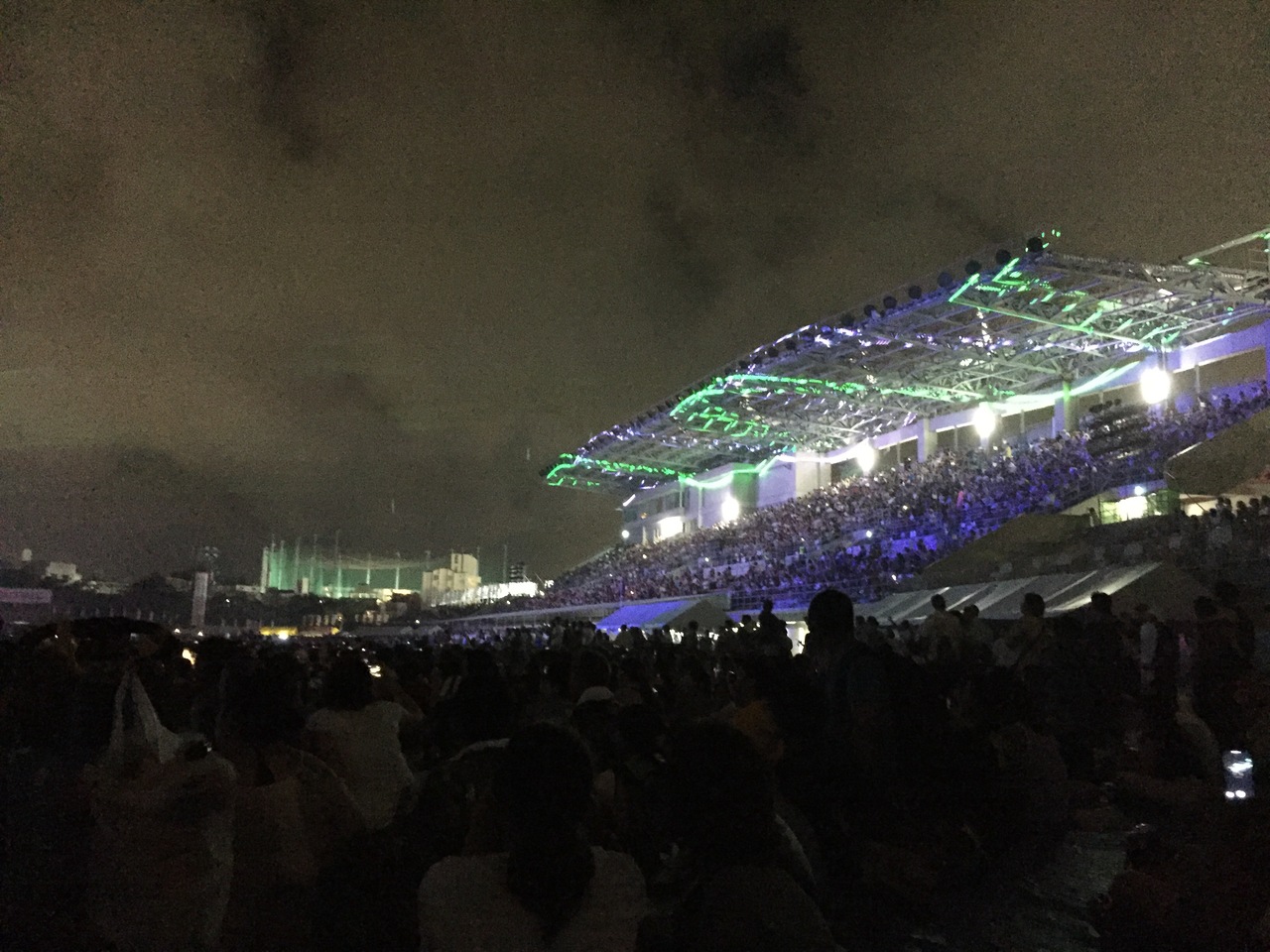 コザ方面行きの路線バスで園田で降りて徒歩15分ほど。夏の終わりに行われる全島エイサーの会場でした。アリーナの前方が舞台で、それを取り囲むように観客がシートをひいて陣取って見ています。スタンド席のみ有料でした。開始時間(3時)ごろはそれほど多くなかった観客も、夜にはアリーナやその周りの芝生も人で埋め尽くされていました。隣の会場ではオリオンビアフェストが行われていました。イベント締めには花火が打ち上げられ、とても盛り上がっていました。