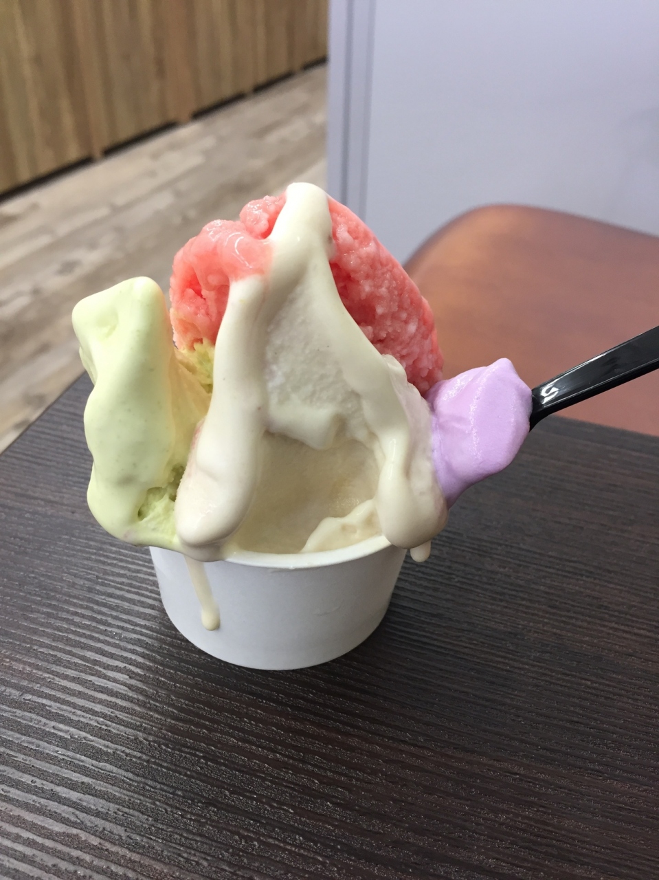 項目がないのでこちらに書きますが、私が行ったのは国際通りにある「海人」の一角にある店舗のやんばるジェラートです。イタリアのジェラートの大会で世界一の賞をとった柴野大造さんプロデュースのジェラートをいただくことができます。