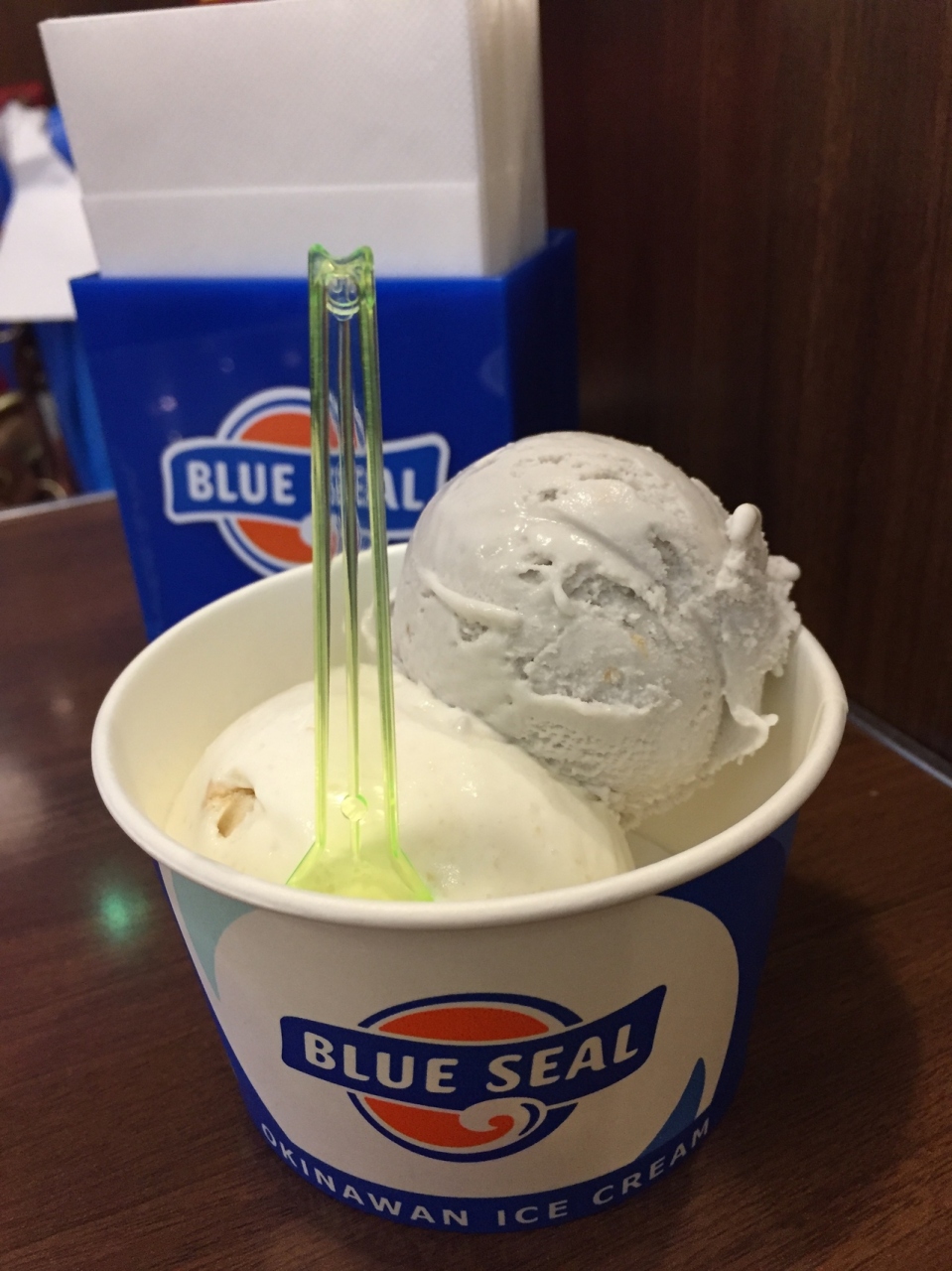 沖縄のアイスといえばブルーシール!JALを利用した際にもらえるちゅらナビを見せると、シングルサイズにワンスクープサービスということでしたが、ワンスクープというよりはシングルがダブルになる勢いでした。さすが沖縄の王者、太っ腹!塩ちんすこう味と田芋チーズケーキ味、どちらもとっても美味しかったです♪